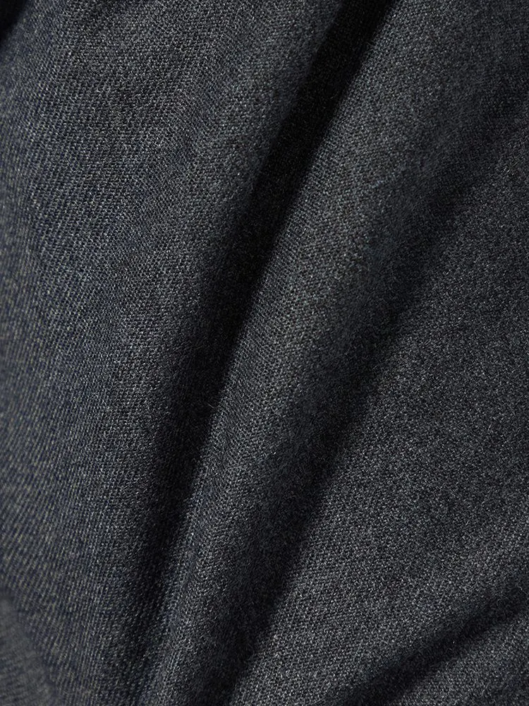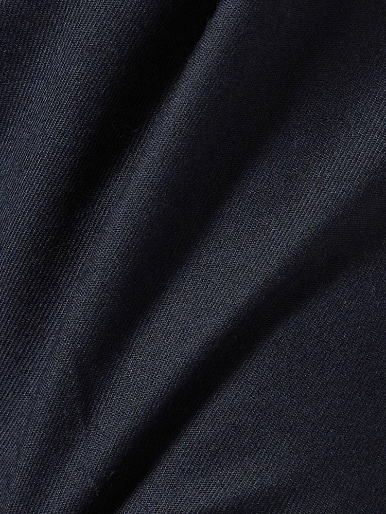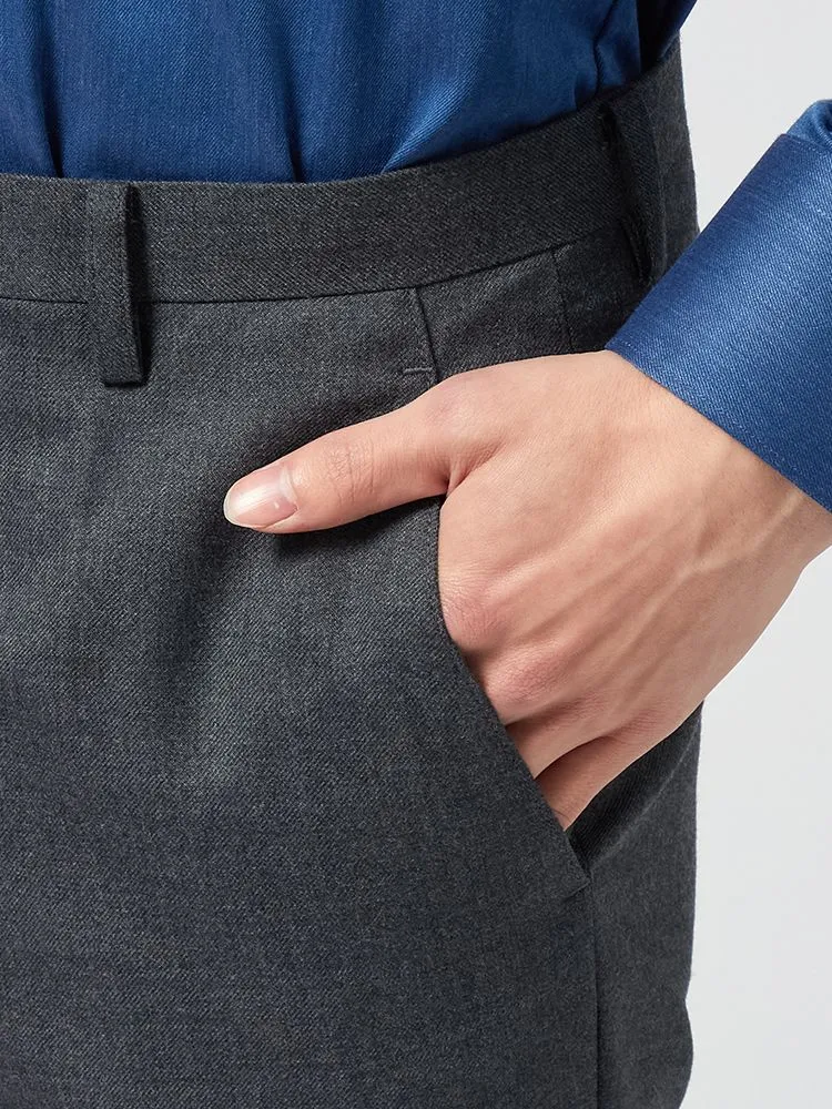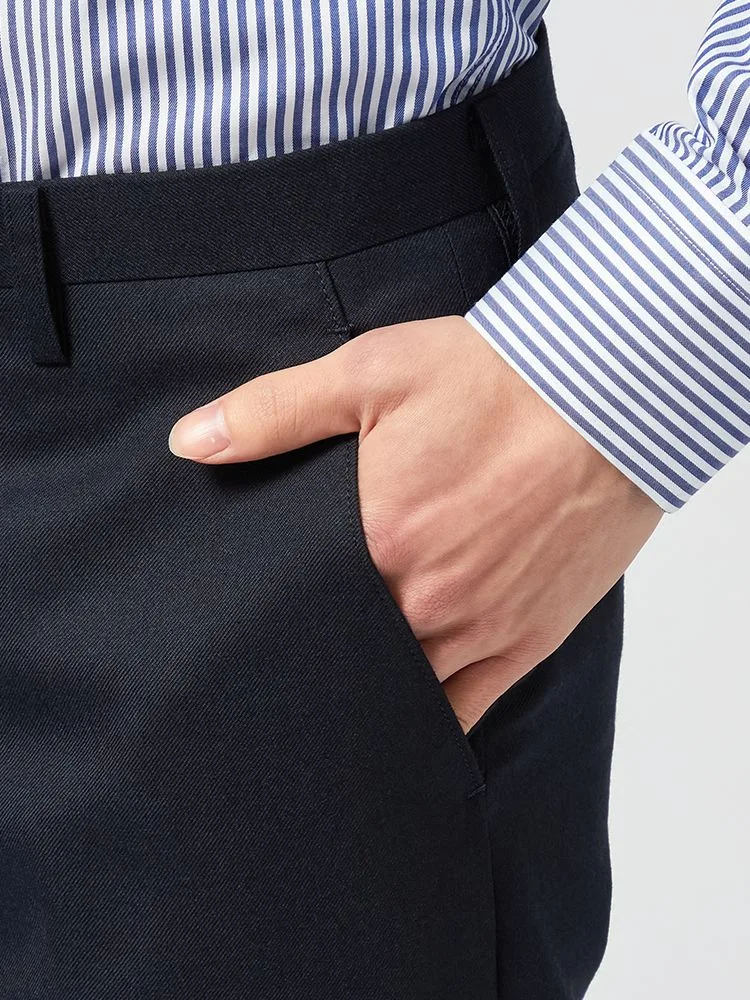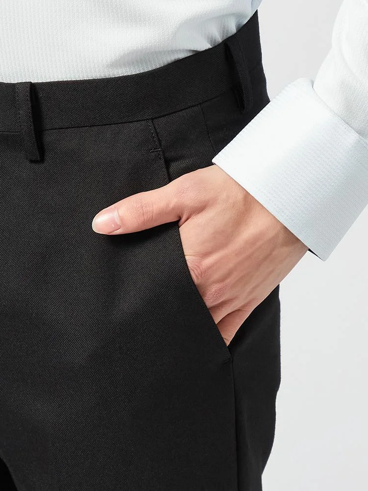 パンツの腰回りに生地の折り込みがなく、スッキリとしたシルエットを実現します。シンプルで洗練された印象を与え、すっきりとした着こなしが可能です。