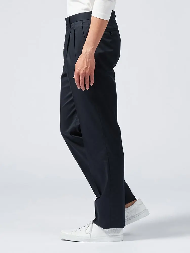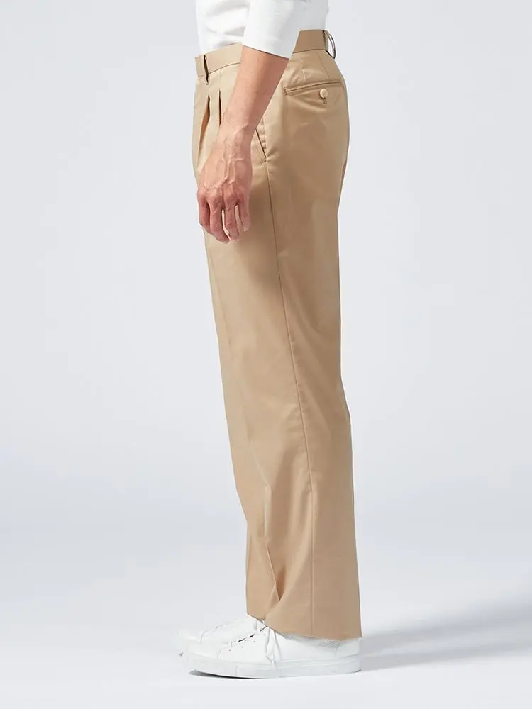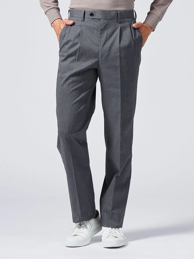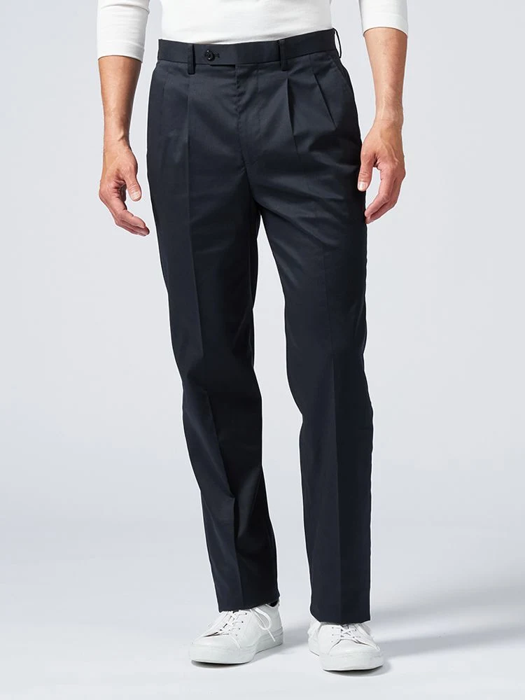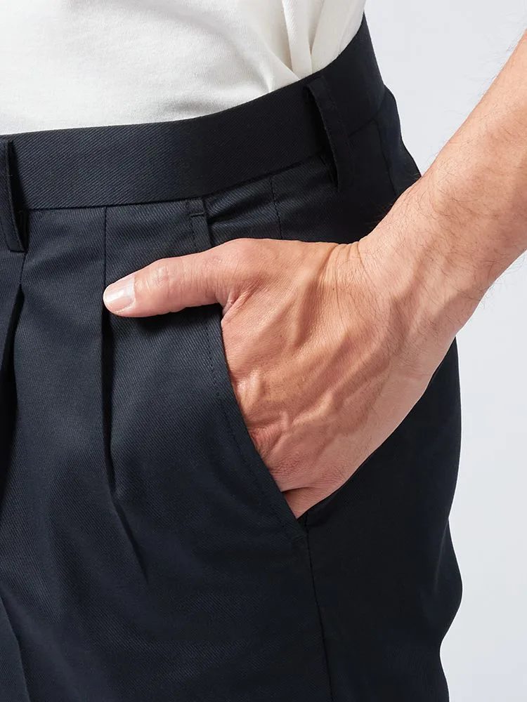 左右に2本ずつ生地の折り込みがあり、ワンタックよりゆとりをもったデザインで、よりリラックスした着心地を提供します