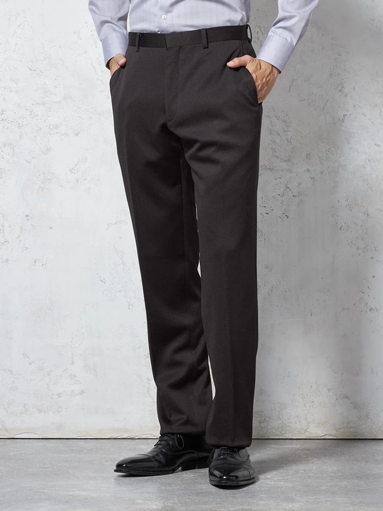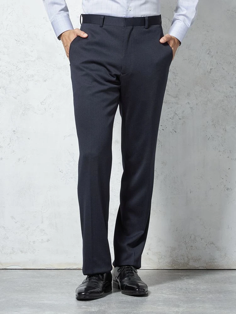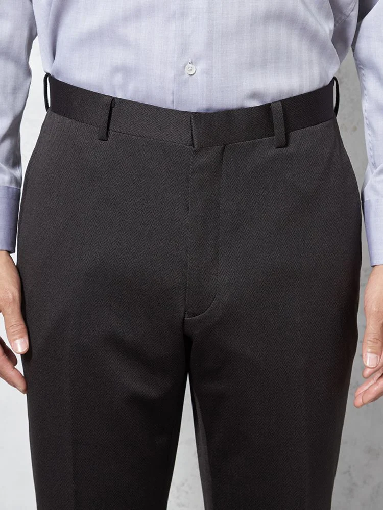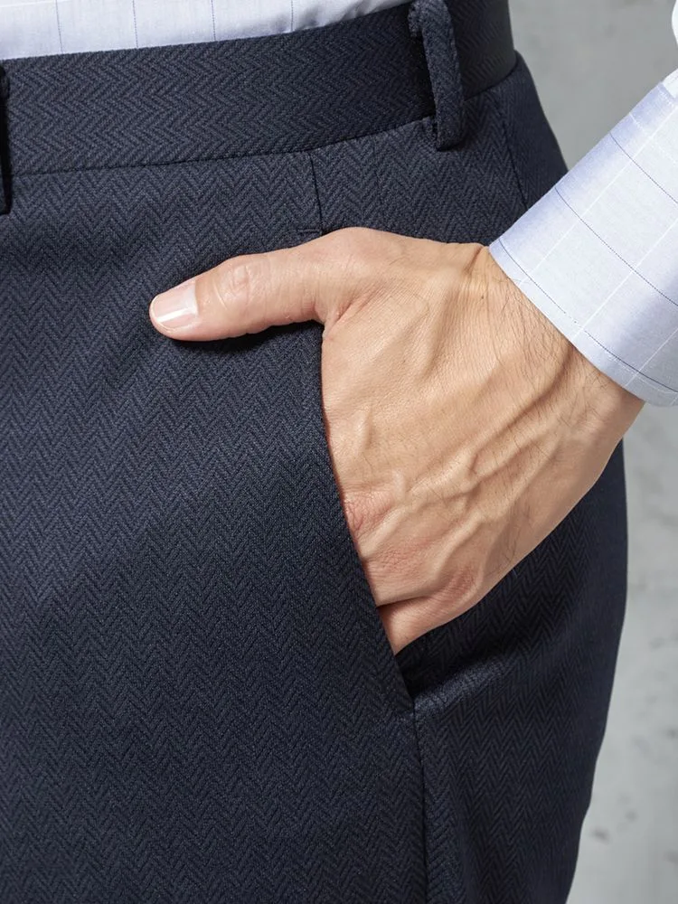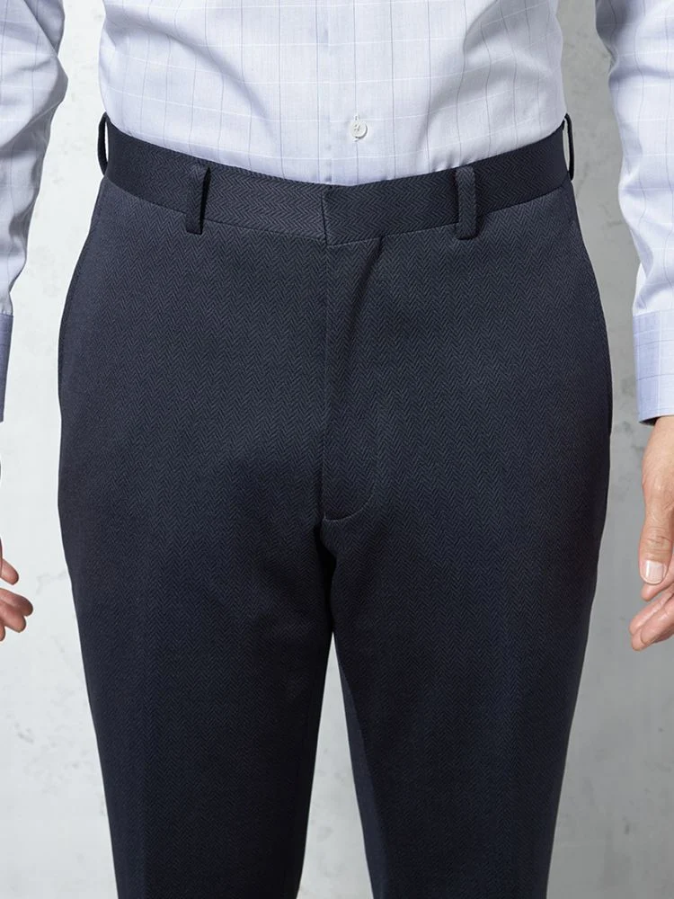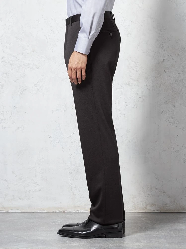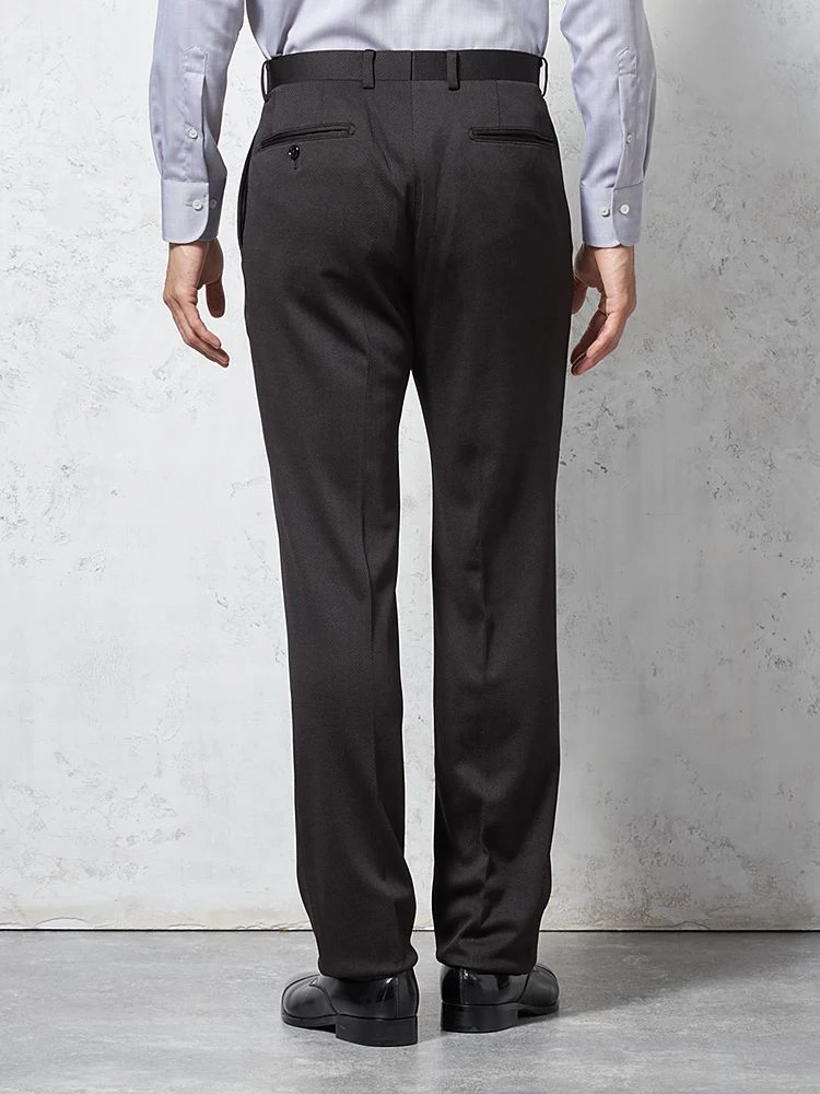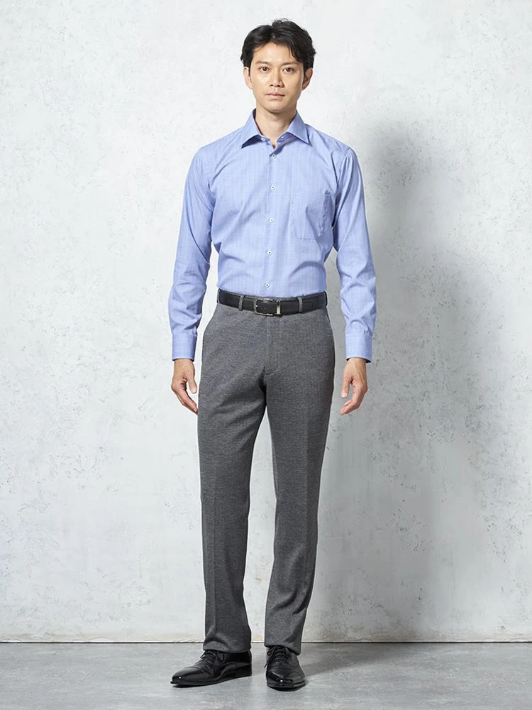 パンツの腰回りに生地の折り込みがなく、スッキリとしたシルエットを実現します。シンプルで洗練された印象を与え、すっきりとした着こなしが可能です。