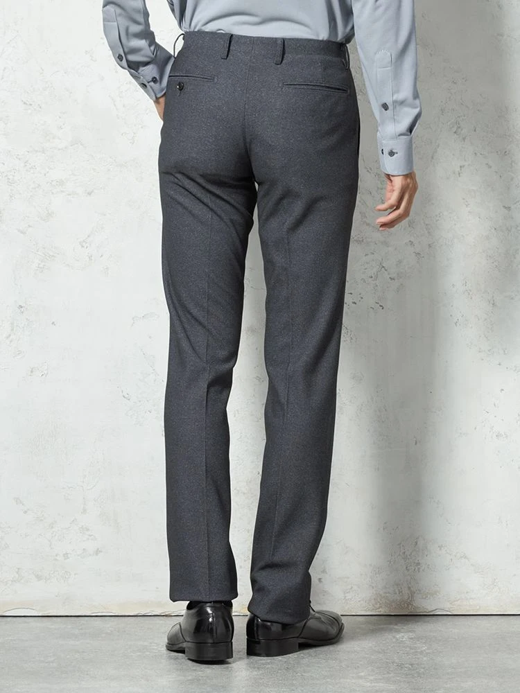 パンツの腰回りに生地の折り込みがなく、スッキリとしたシルエットを実現します。シンプルで洗練された印象を与え、すっきりとした着こなしが可能です。