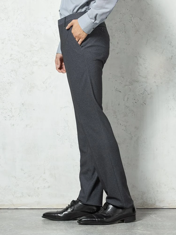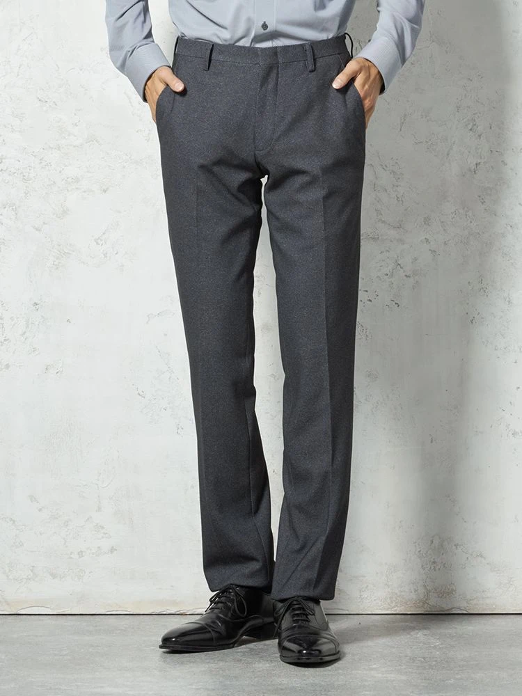 いつものスタイルに取り入れやすい、シンプルな無地のスリムスラックス。