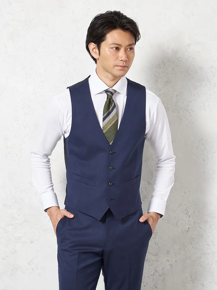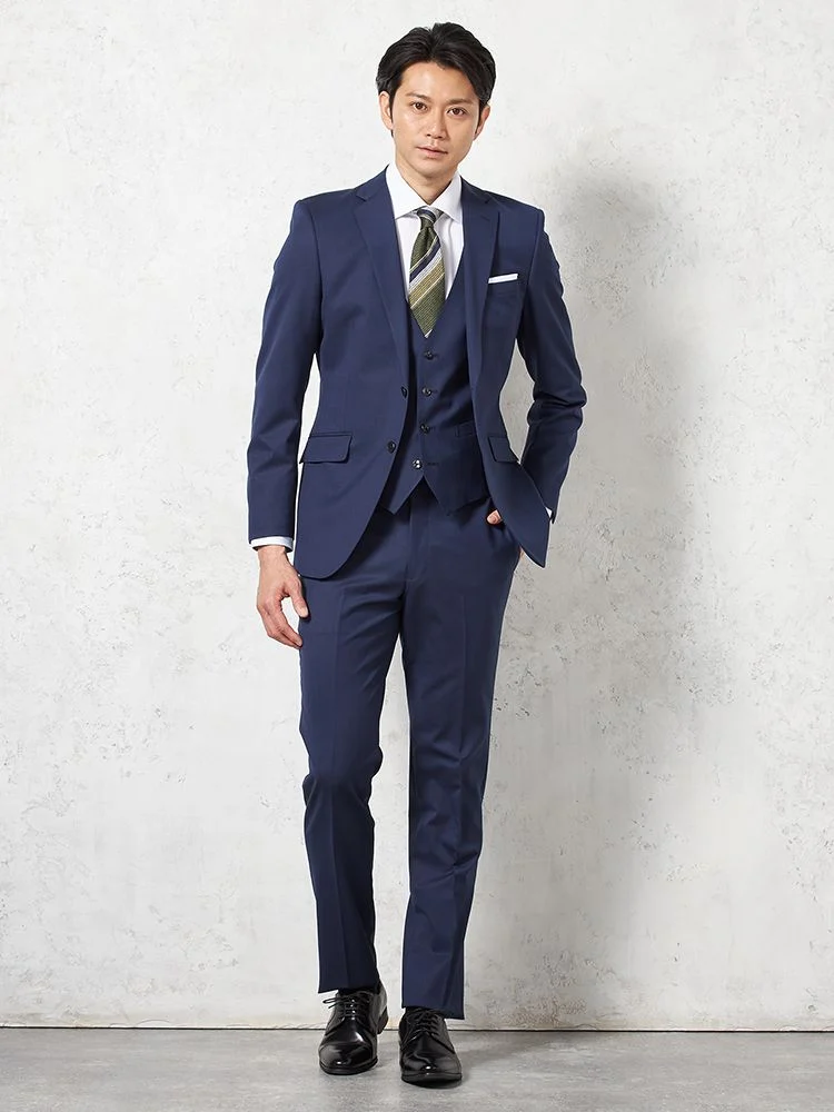 ジャケット、パンツ、ベストの3点セットで、スーツ全体を簡単にコーディネートできます。ビジネスやフォーマルな場面に最適です。