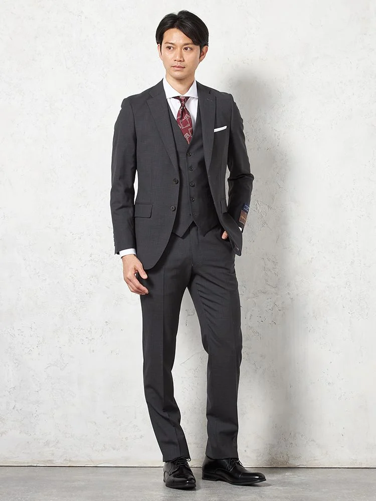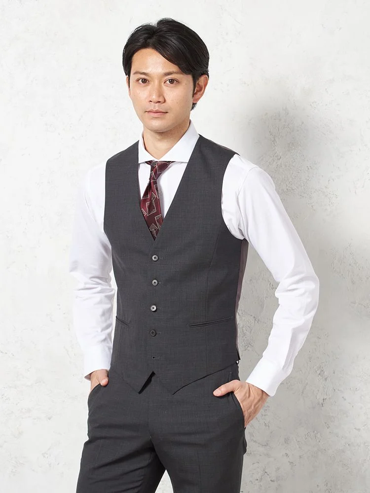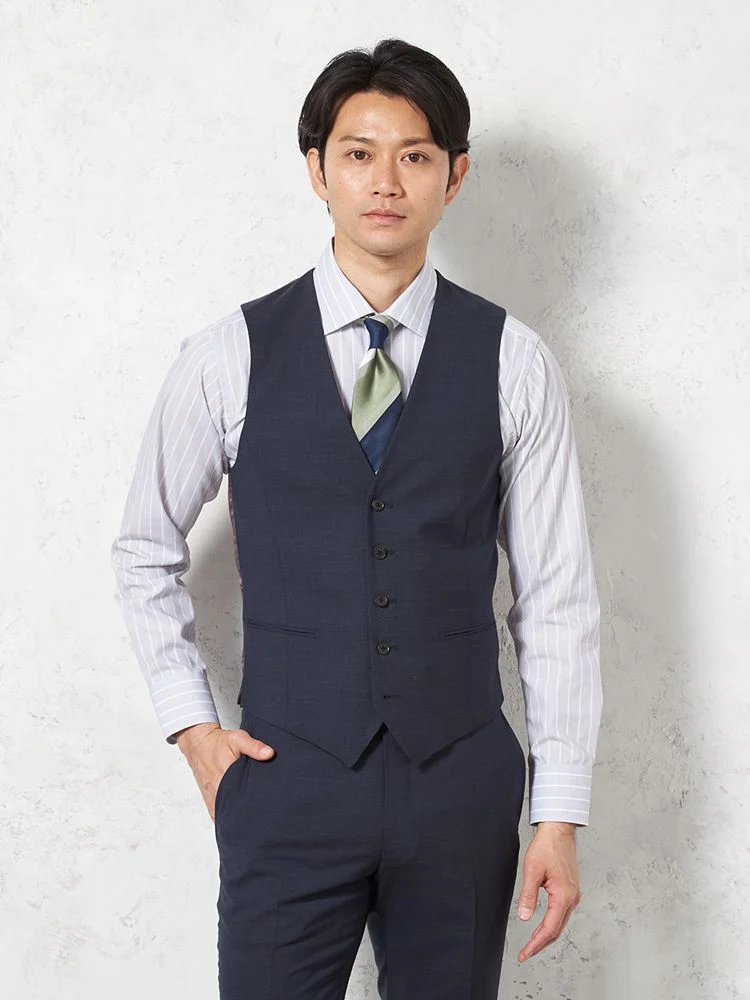 ジャケット、パンツ、ベストの3点セットで、スーツ全体を簡単にコーディネートできます。ビジネスやフォーマルな場面に最適です。