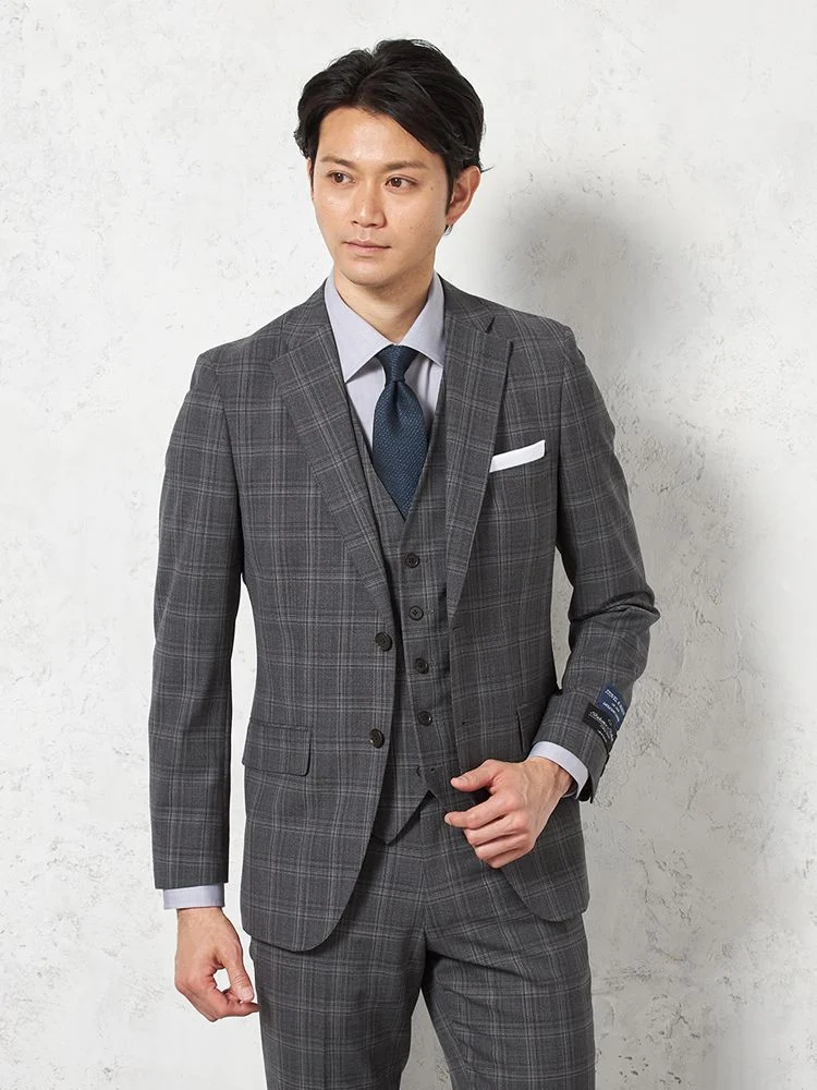 シックなチェック柄がクラシカルな3ピーススーツ。