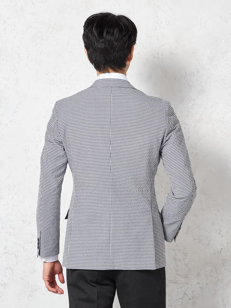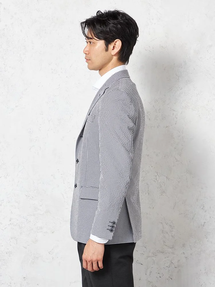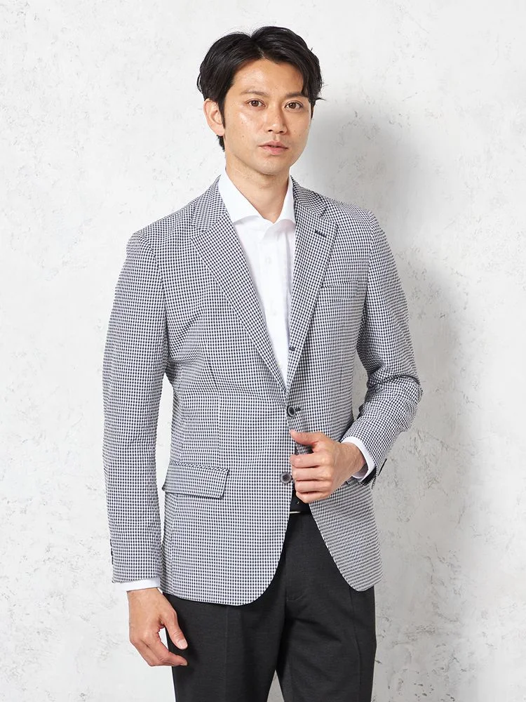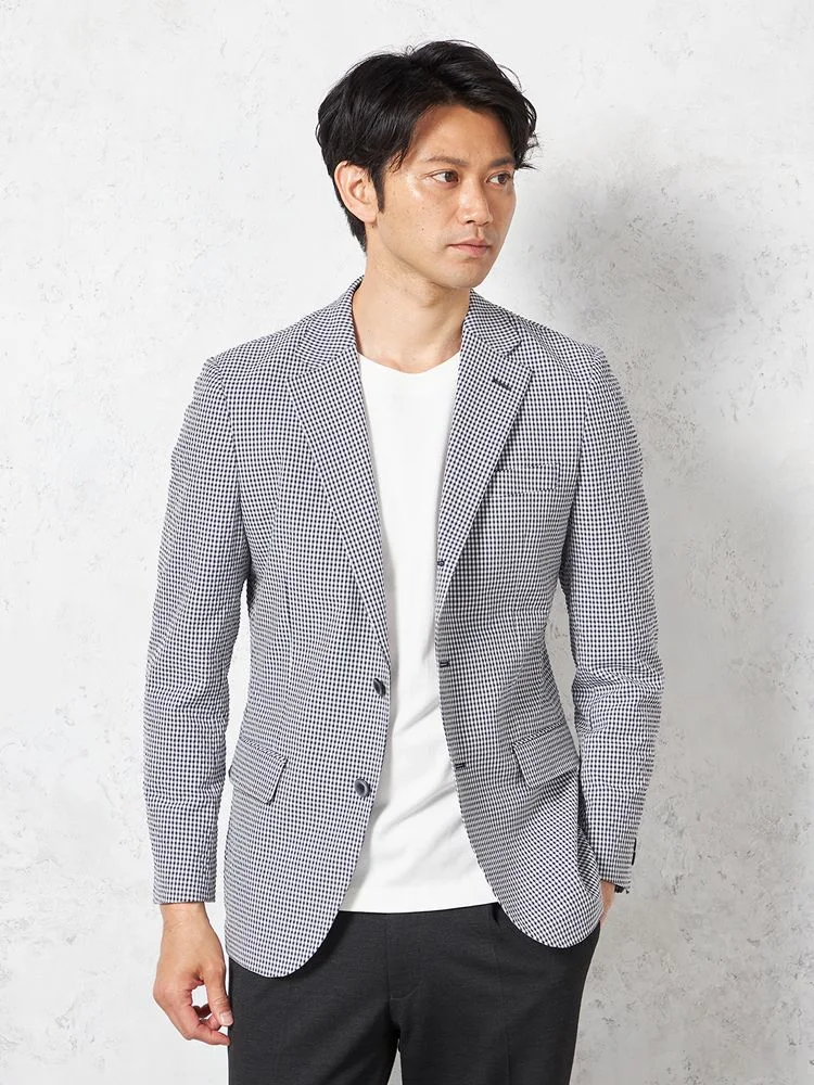 【ウォッシャブル】ジャケット 段返り3つボタン ストレッチサッカー素材 軽量 マイクロチェック 春夏