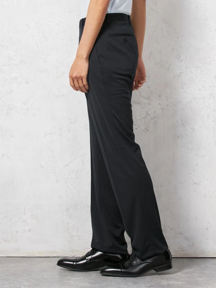 パンツの腰回りに生地の折り込みがなく、スッキリとしたシルエットを実現します。シンプルで洗練された印象を与え、すっきりとした着こなしが可能です。