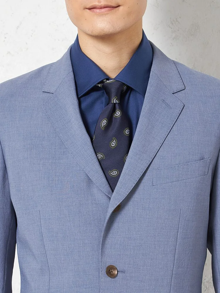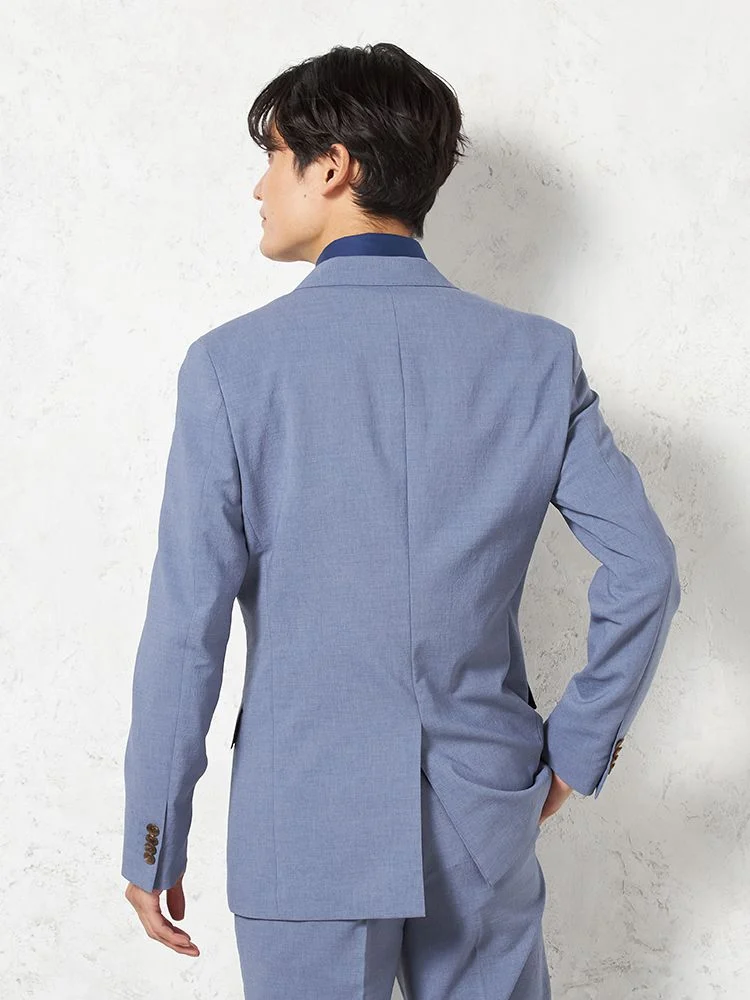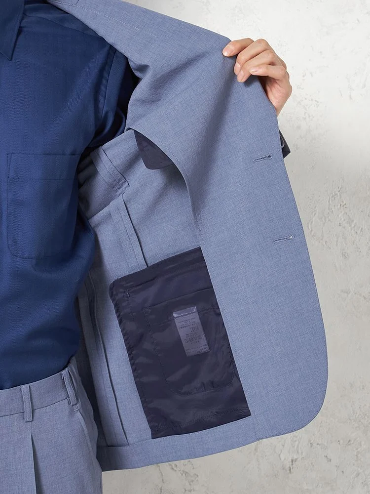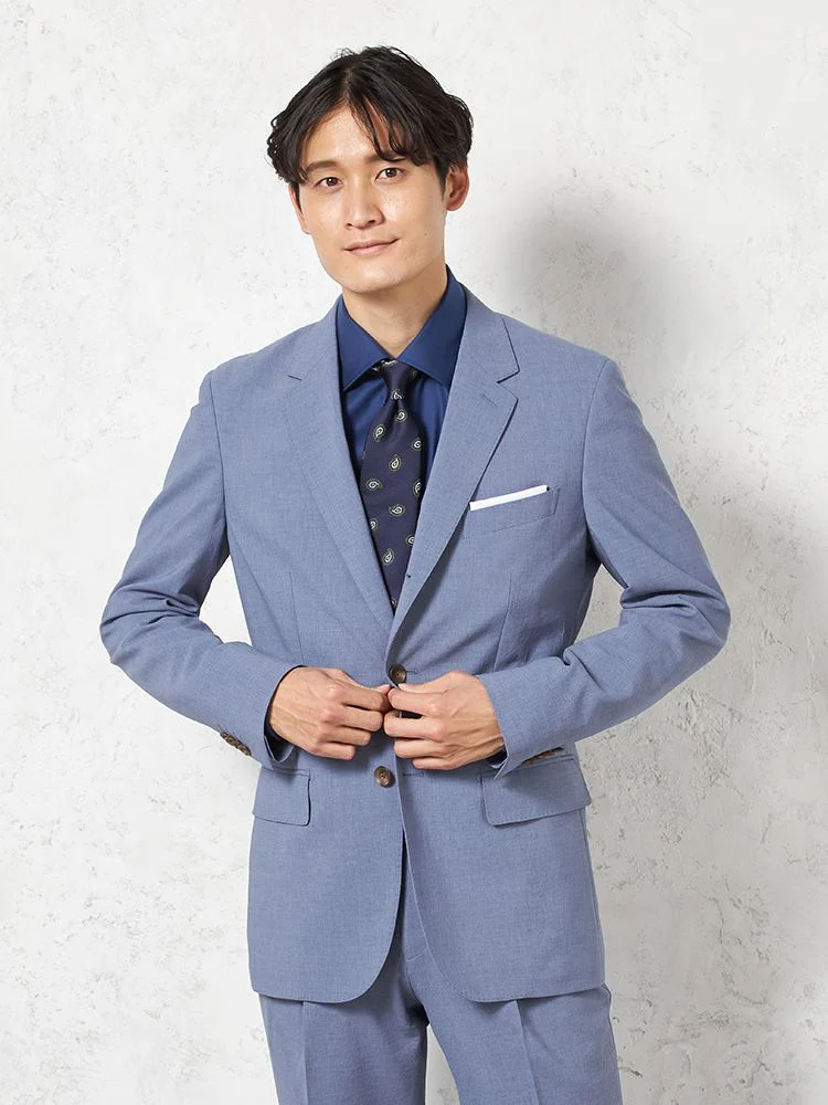 春夏の装いに取り入れたい、清涼感のあるサックスカラーのスーツ。