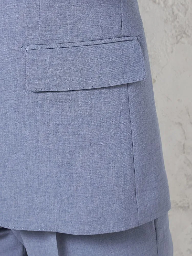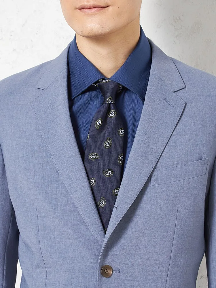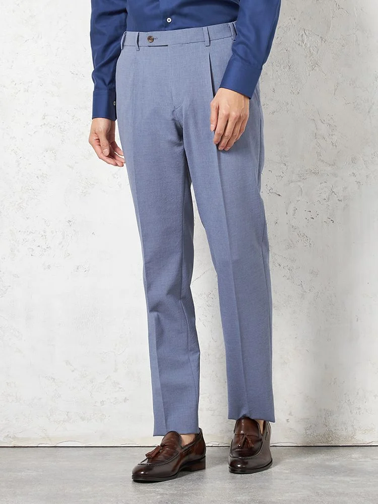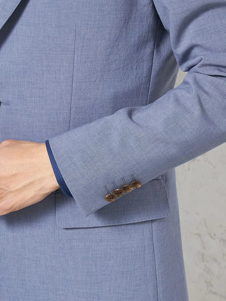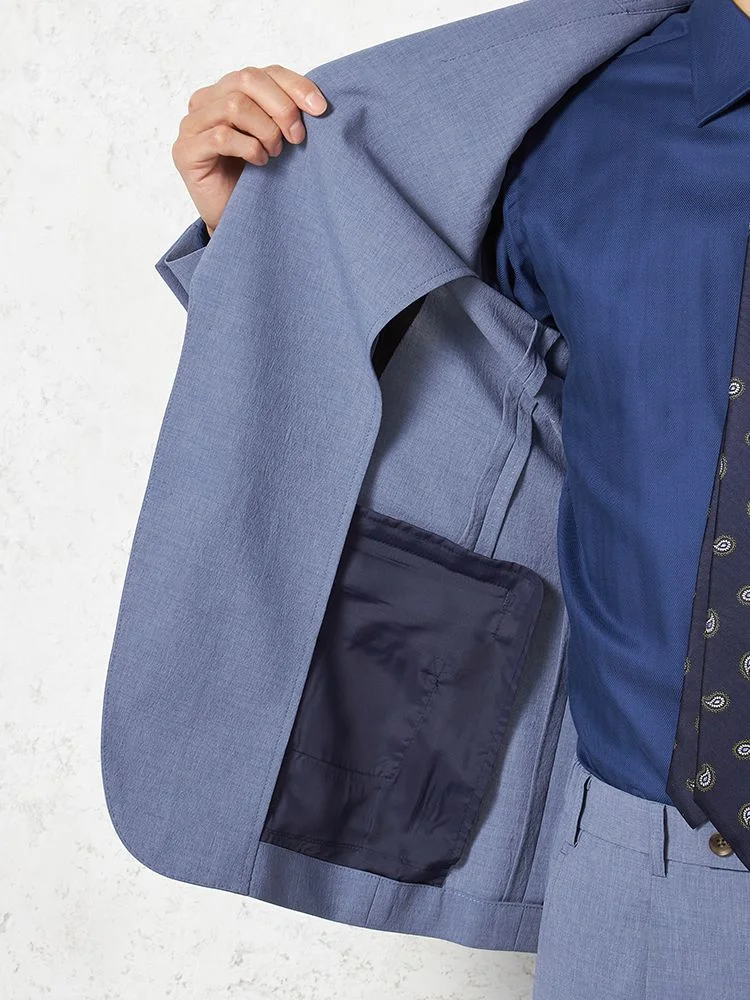 春夏の装いに取り入れたい、清涼感のあるサックスカラーのスーツ。