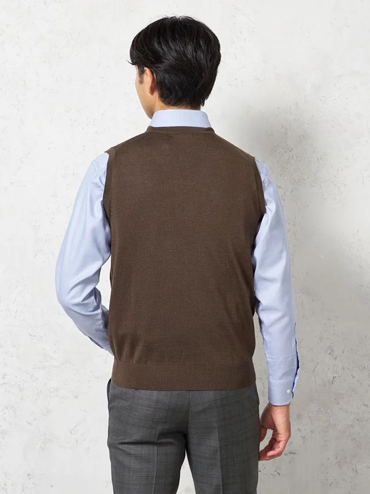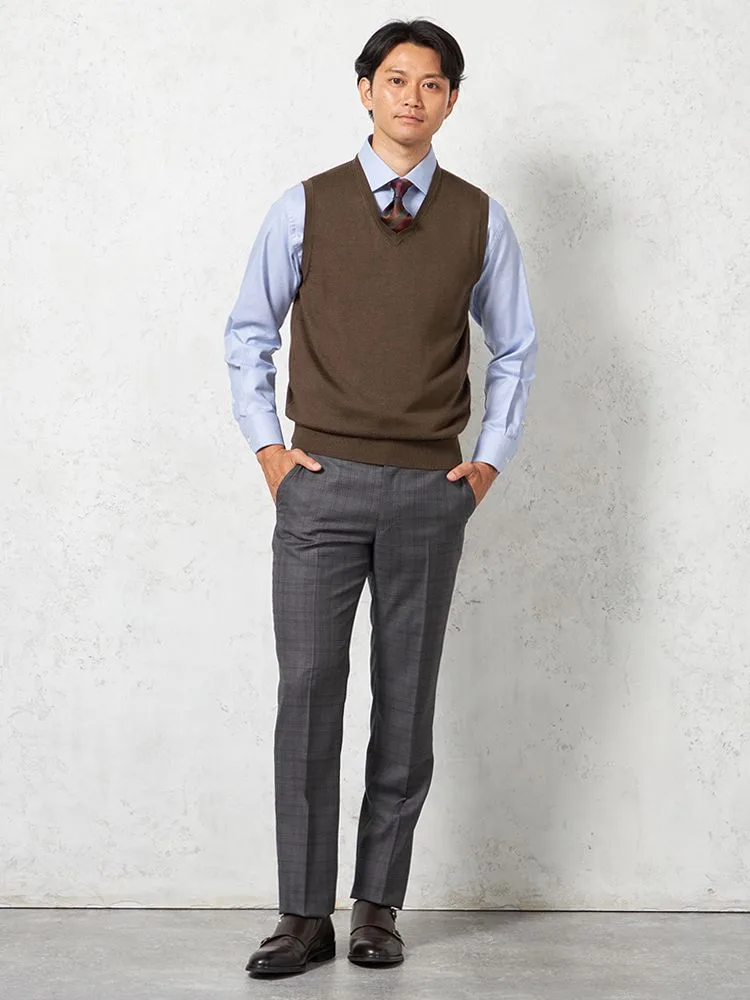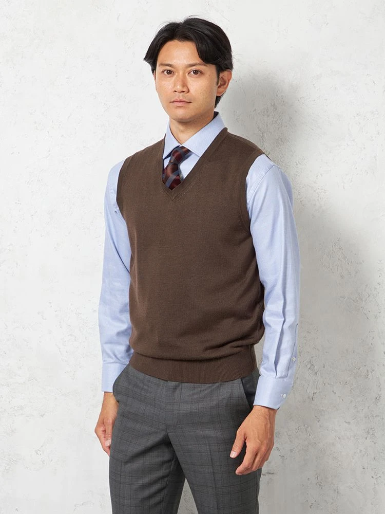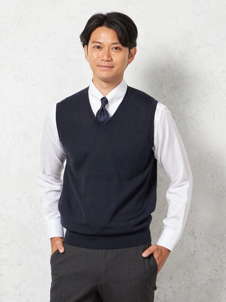 肌寒い日に、スーツの中に重ねやすいVネックのニットベスト。
