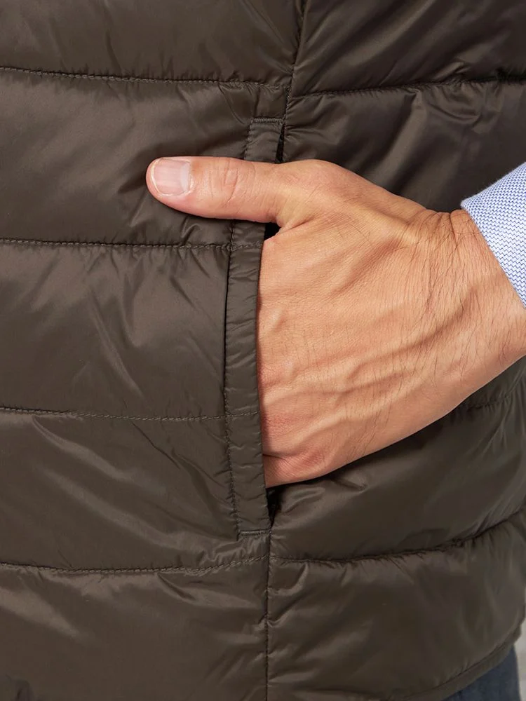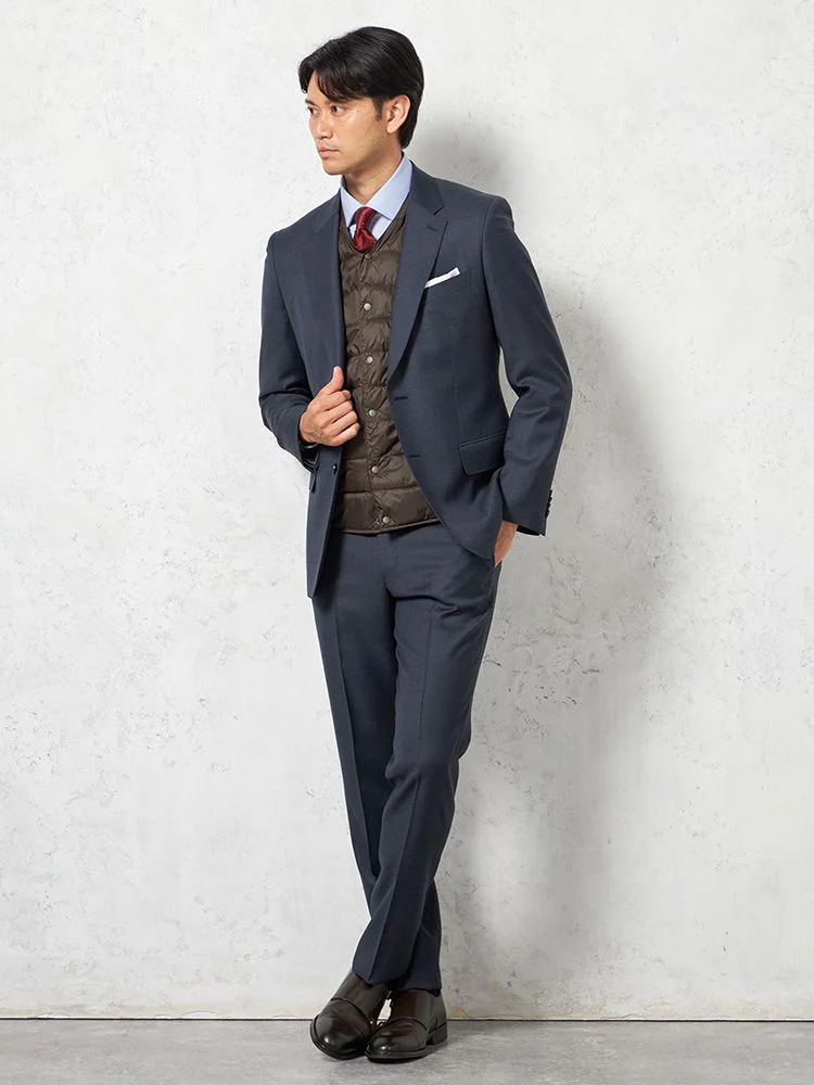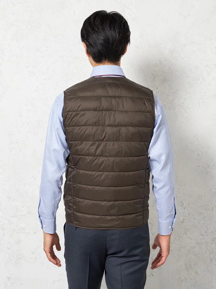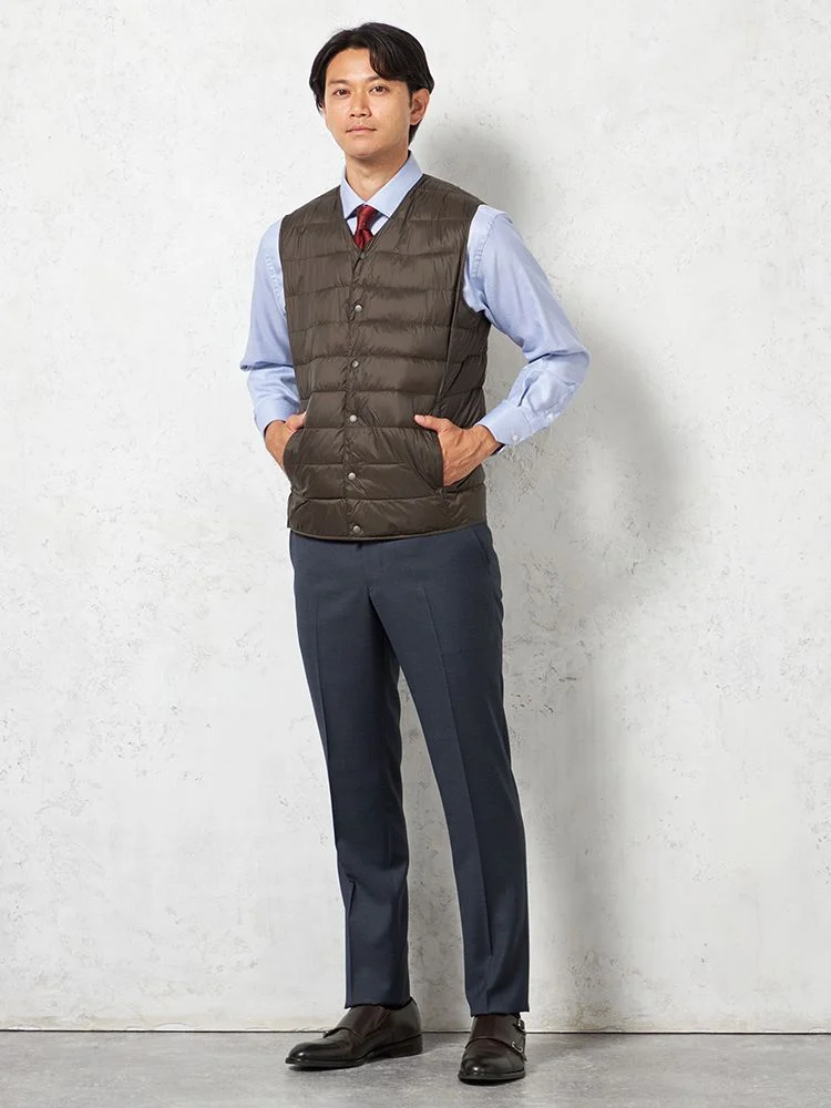 さらりと羽織れるライトなアウターとしても、ジャケットのライナーとしても使用できる中綿Vネックベスト 。