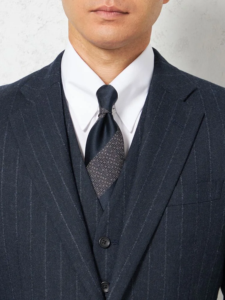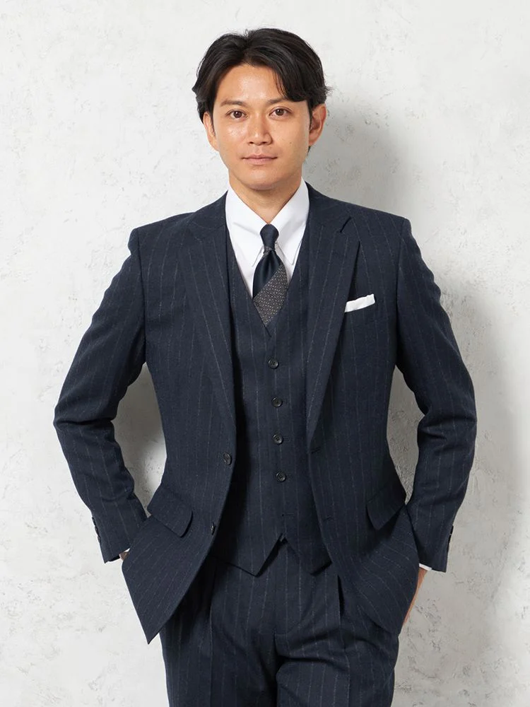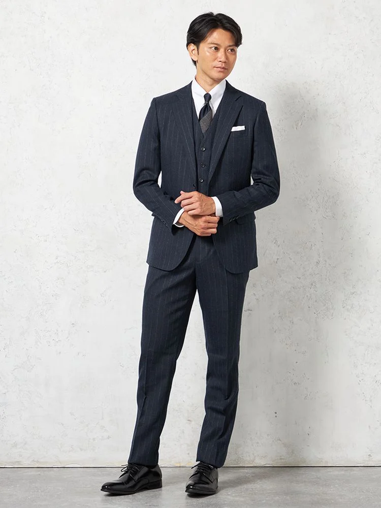 膨らみある三小糸使いで、暖かさと軽さを両立させた素材で仕立てたスリーピーススーツ。