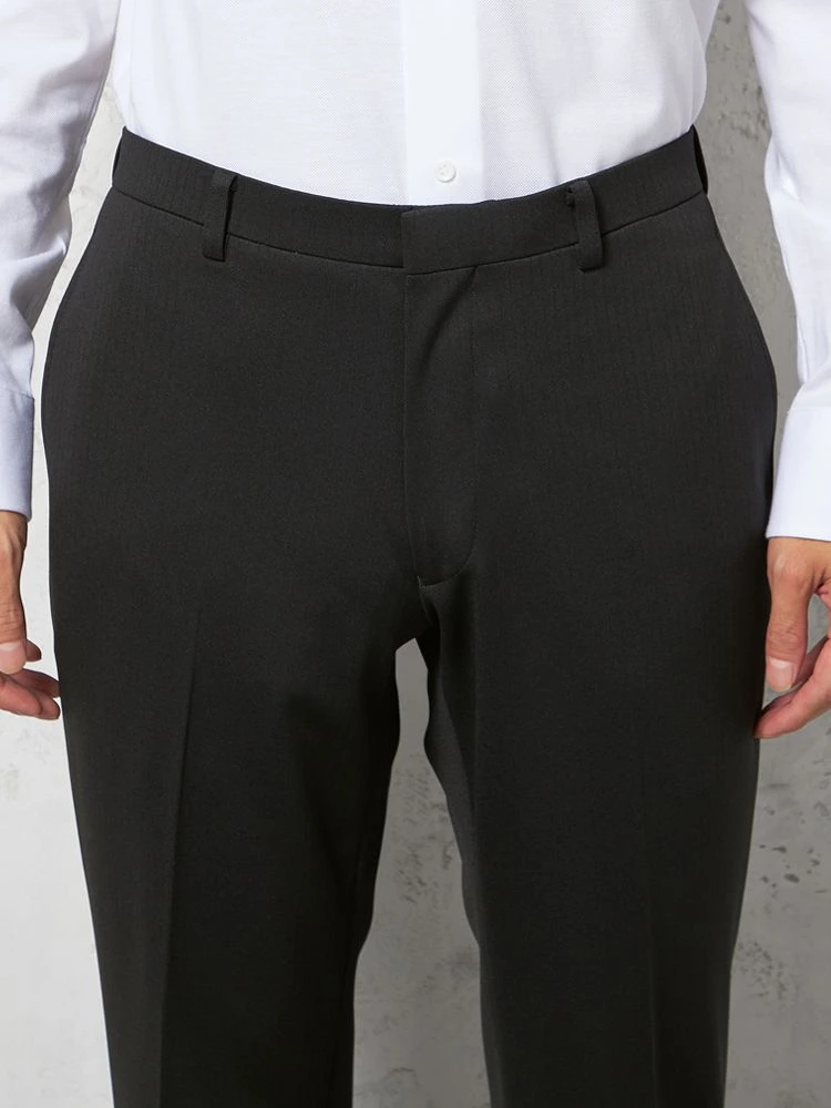 パンツの腰回りに生地の折り込みがなく、スッキリとしたシルエットを実現します。シンプルで洗練された印象を与え、すっきりとした着こなしが可能です。