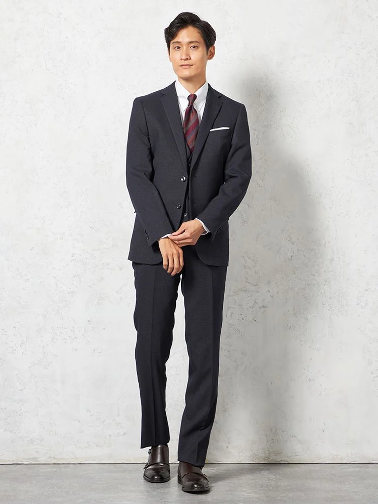 ウールタッチのストレッチ性のある柔らかなポリエステル100%素材使用したスリーピーススーツです。