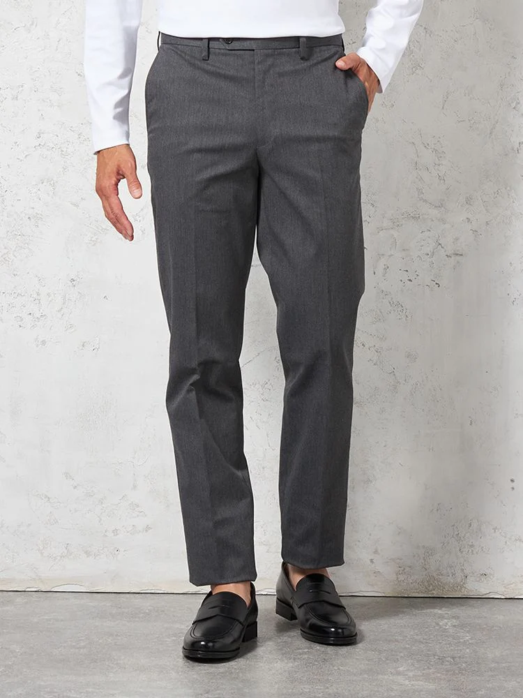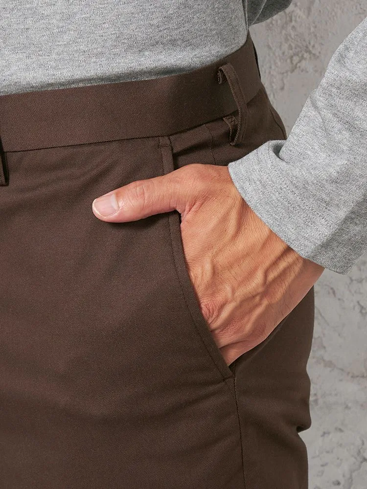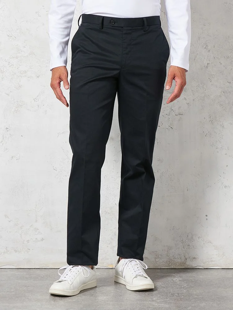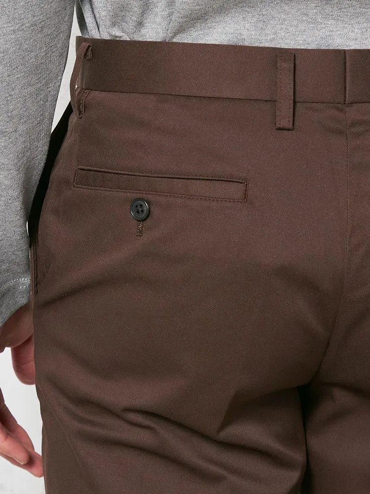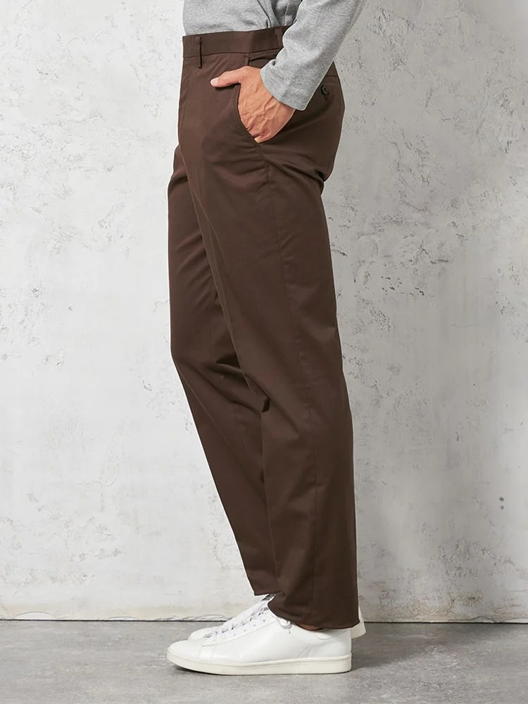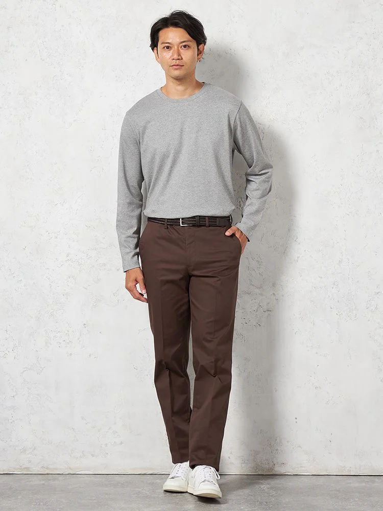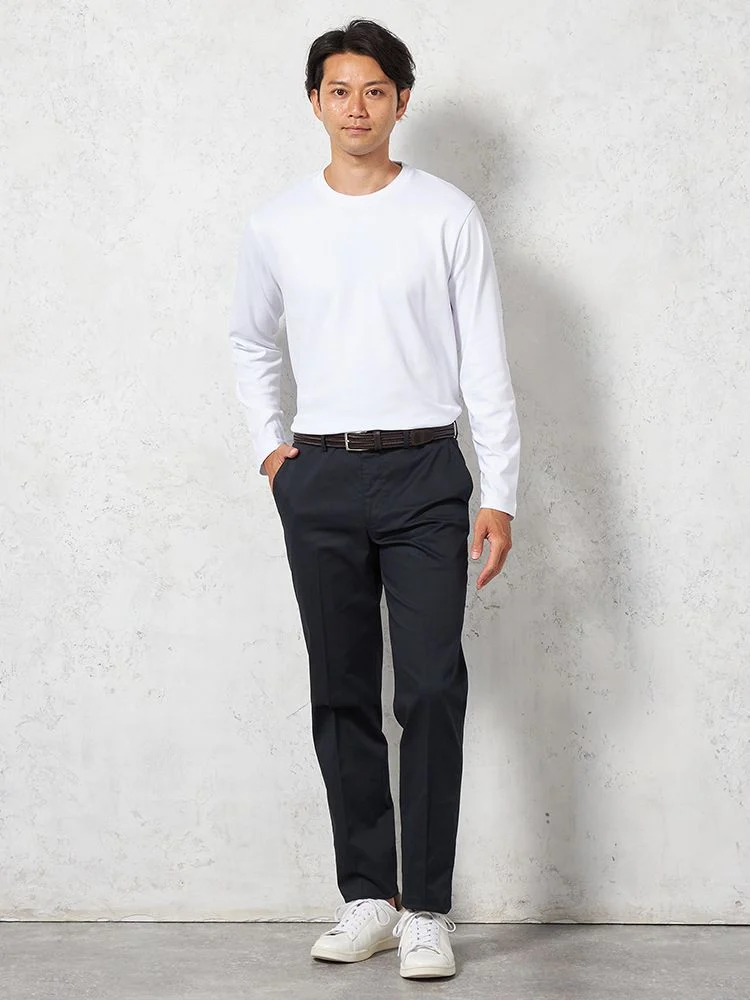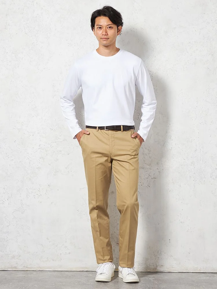 定番的に穿きこなせるノータックのチノパンツ。