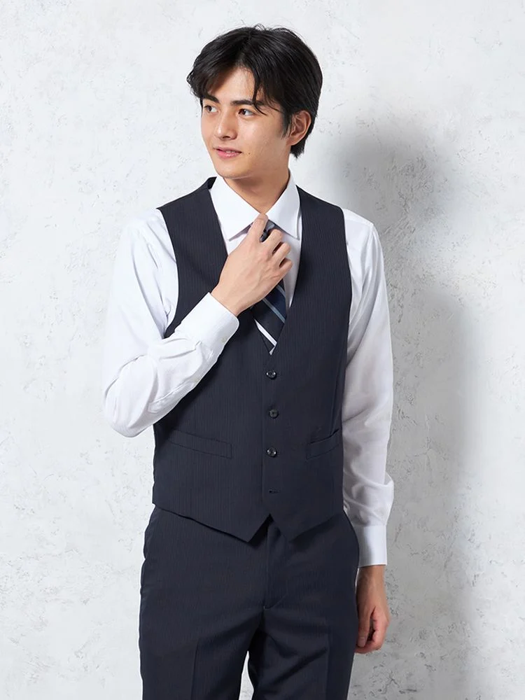 スマートにフォーマルな表情を演出できるベストつきスーツ。