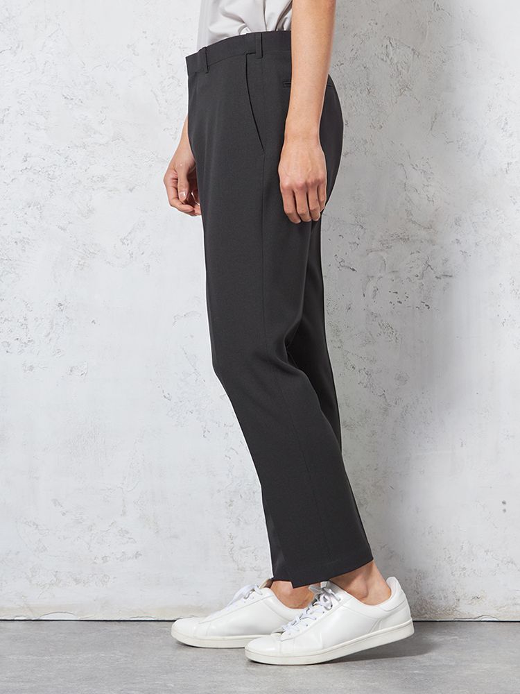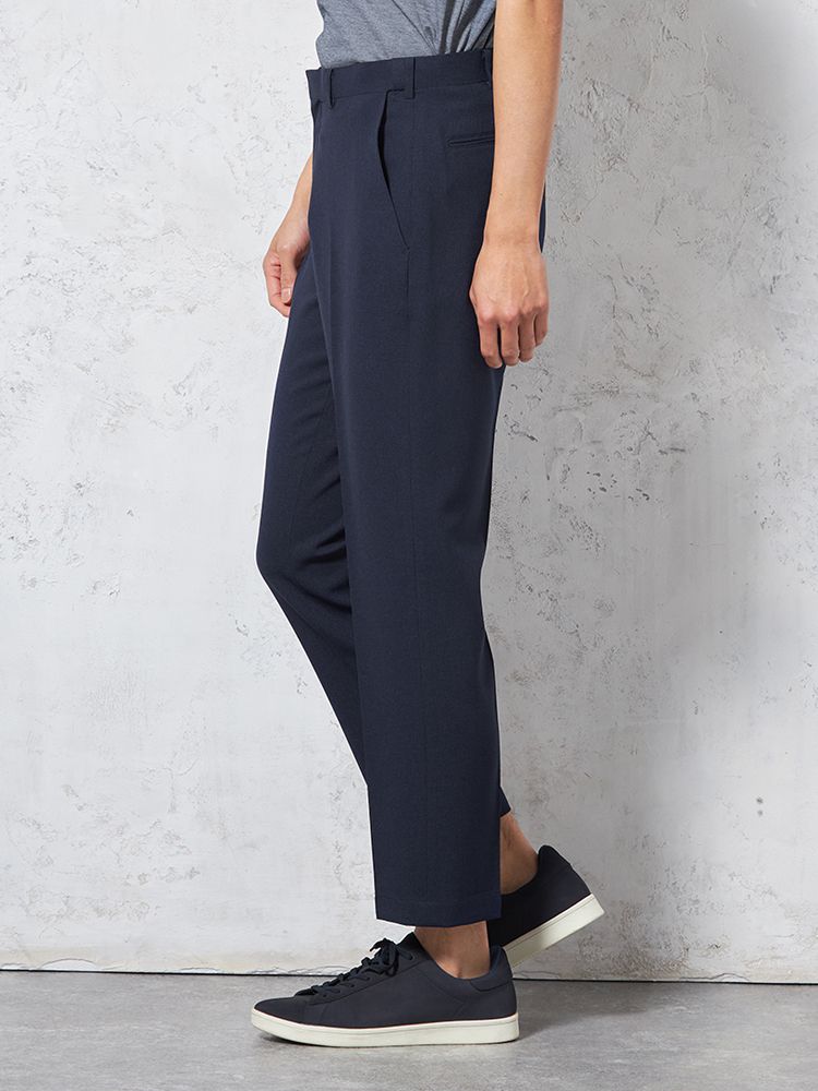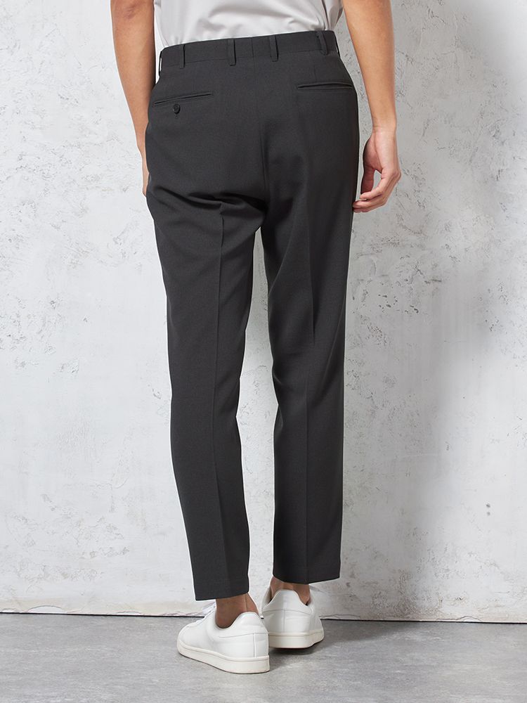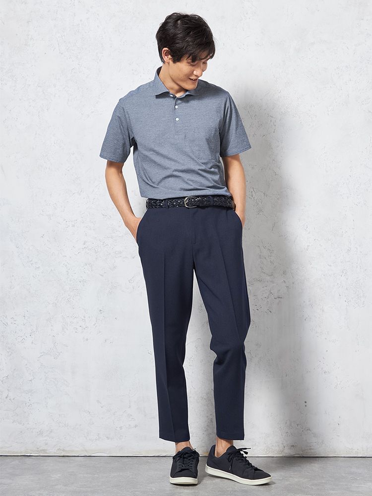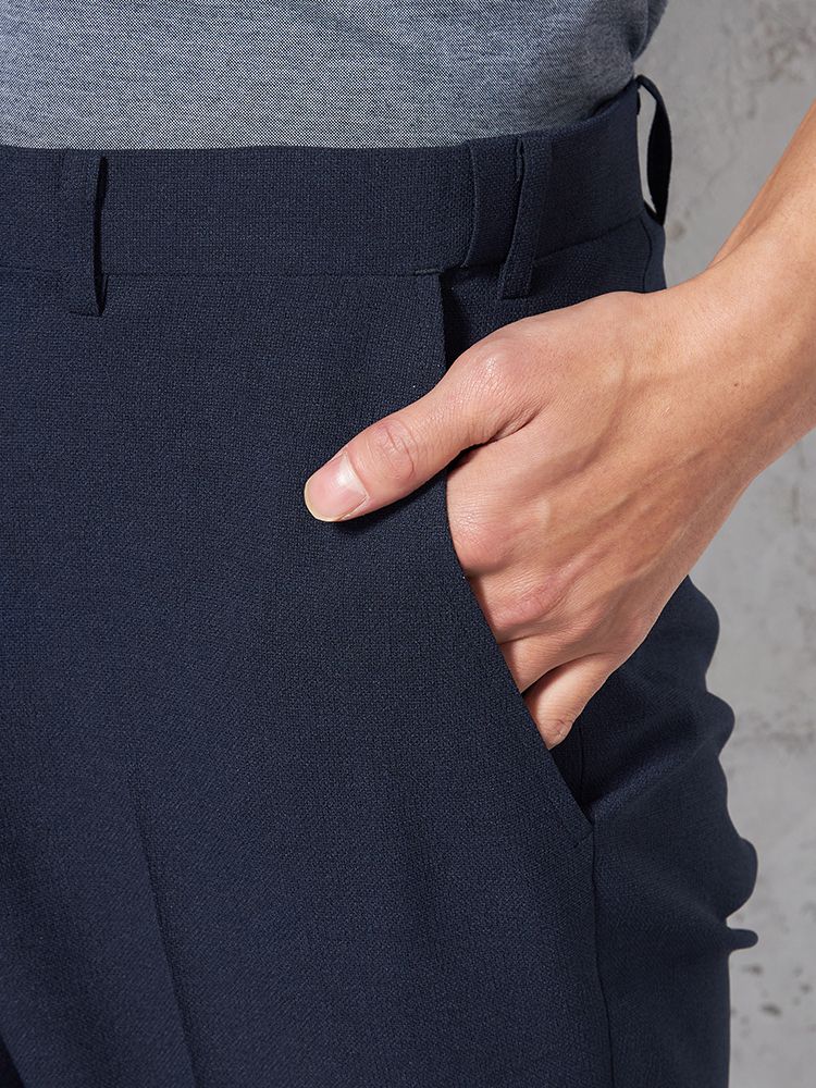 ノータックの腰回りと程よいテーパードのすっきりとしたシルエットに加え、ヒップポケットの位置にもこだわっており、後ろ姿も洗練された印象に。