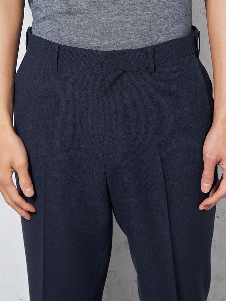 パンツの腰回りに生地の折り込みがなく、スッキリとしたシルエットを実現します。シンプルで洗練された印象を与え、すっきりとした着こなしが可能です。