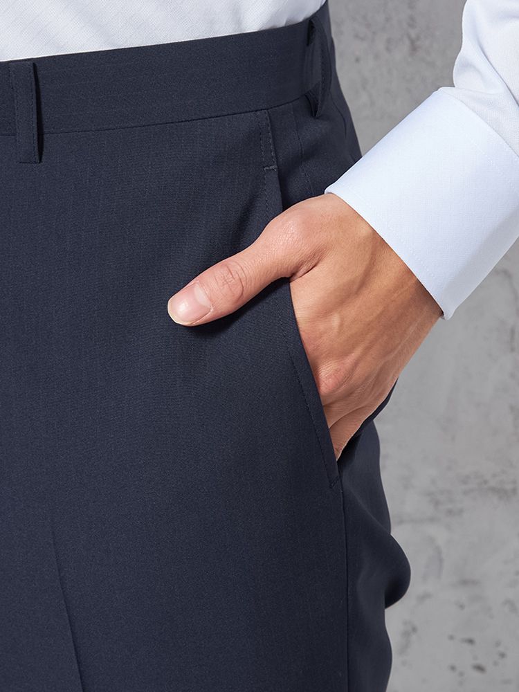 パンツの腰回りに生地の折り込みがなく、スッキリとしたシルエットを実現します。シンプルで洗練された印象を与え、すっきりとした着こなしが可能です。