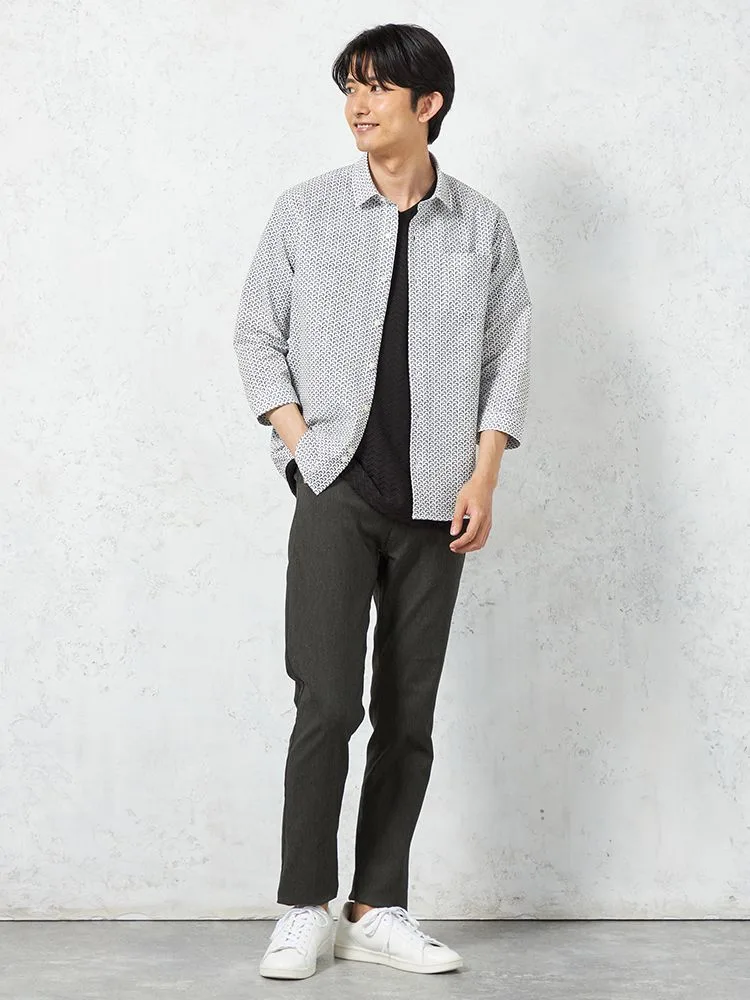 凹凸のある素材の上からプリントを重ねた、総柄の七分袖シャツ。