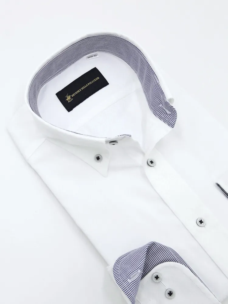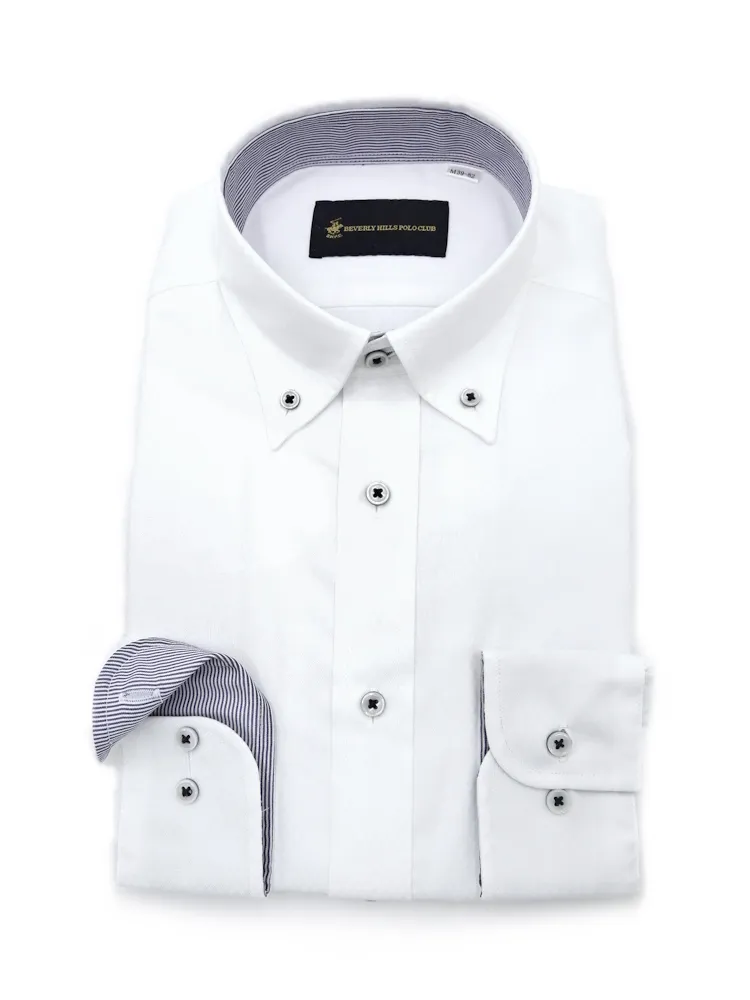 【形態安定】長袖ワイシャツ ボタンダウン 別布 ホワイト 織柄無地 ビバリーヒルズポロクラブ 通年