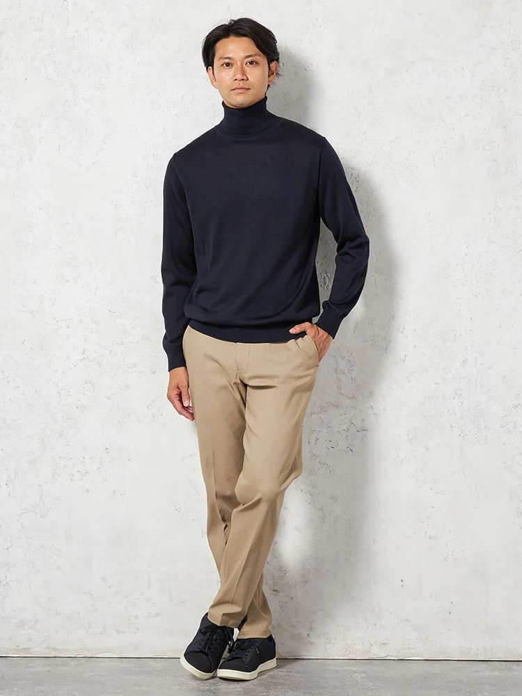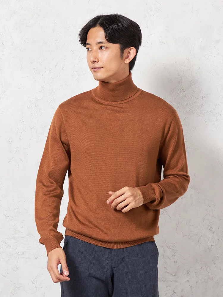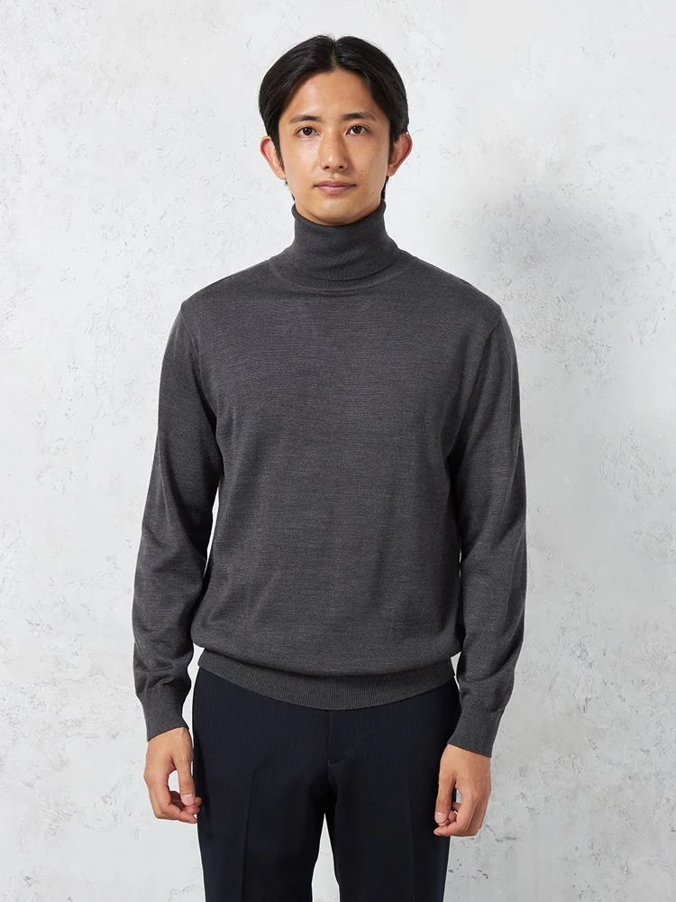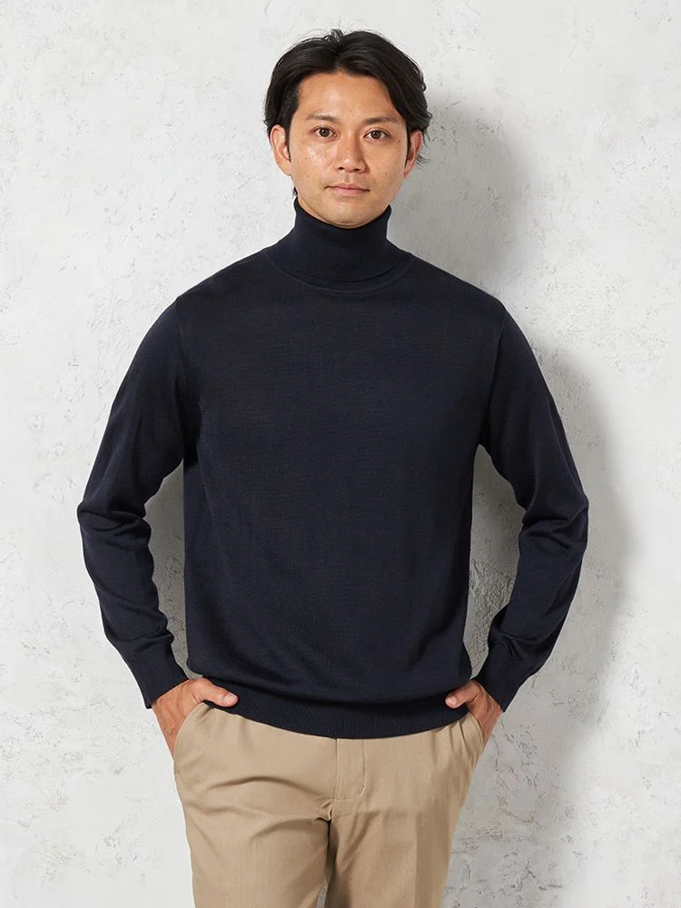 重ね着スタイルにも適している、程よい厚みの長袖タートルネックです。