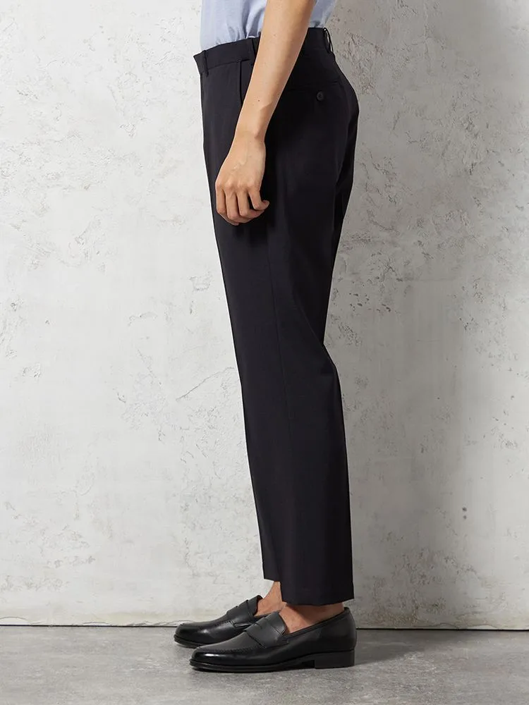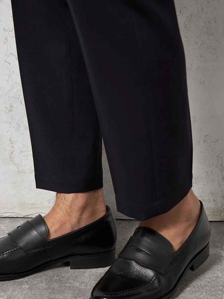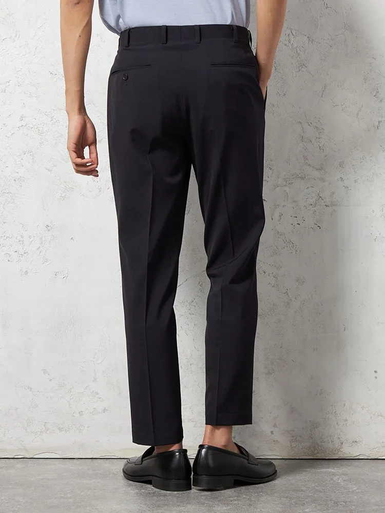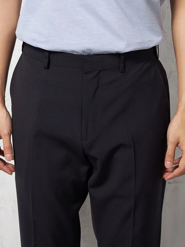 パンツの腰回りに生地の折り込みがなく、スッキリとしたシルエットを実現します。シンプルで洗練された印象を与え、すっきりとした着こなしが可能です。