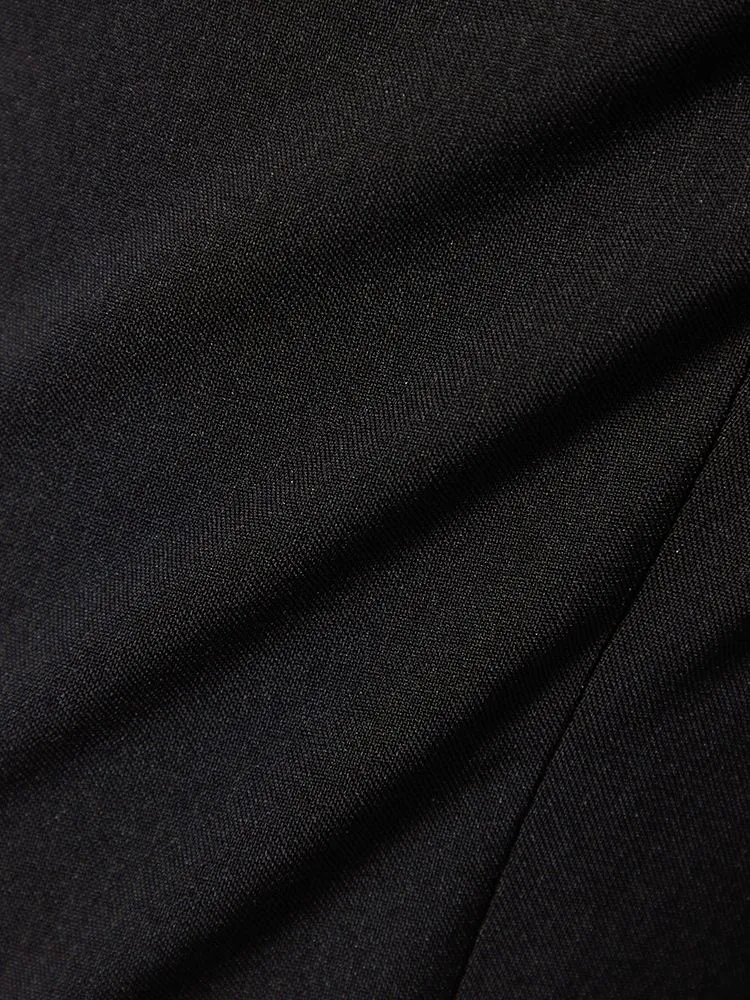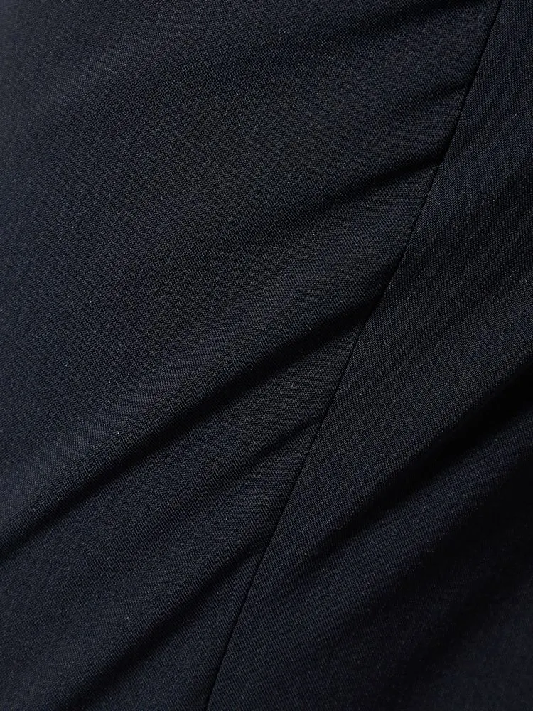 パンツの腰回りに生地の折り込みがなく、スッキリとしたシルエットを実現します。シンプルで洗練された印象を与え、すっきりとした着こなしが可能です。