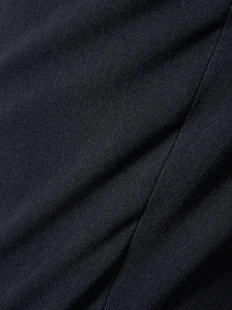 パンツの腰回りに生地の折り込みがなく、スッキリとしたシルエットを実現します。シンプルで洗練された印象を与え、すっきりとした着こなしが可能です。