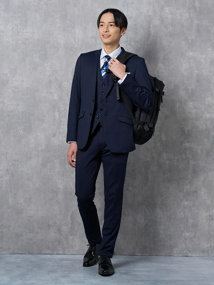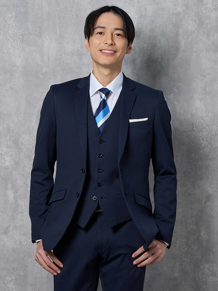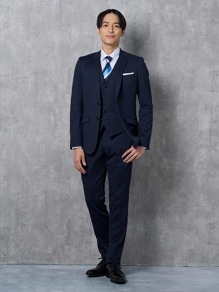 脚長スリムデザインと便利な機能をつけた贅沢な褒められスリーピーススーツです。