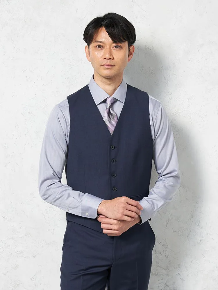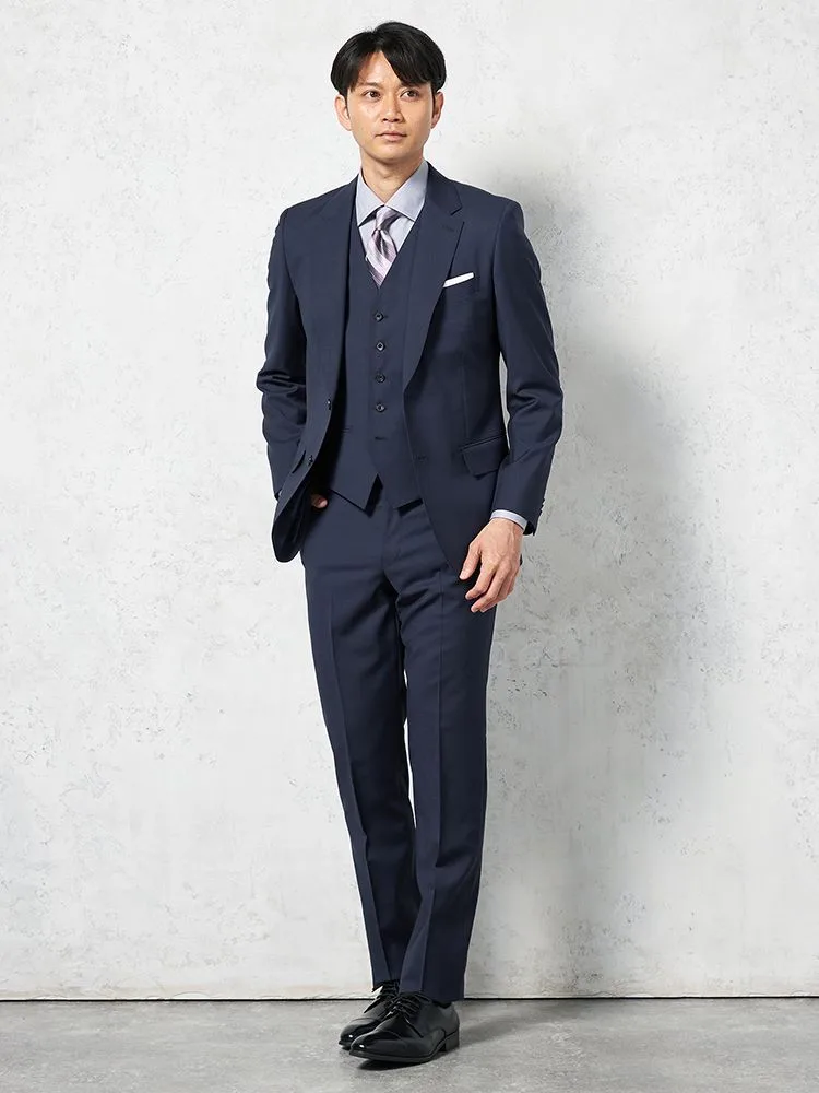 ジャケット、パンツ、ベストの3点セットで、スーツ全体を簡単にコーディネートできます。ビジネスやフォーマルな場面に最適です。