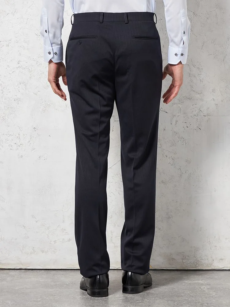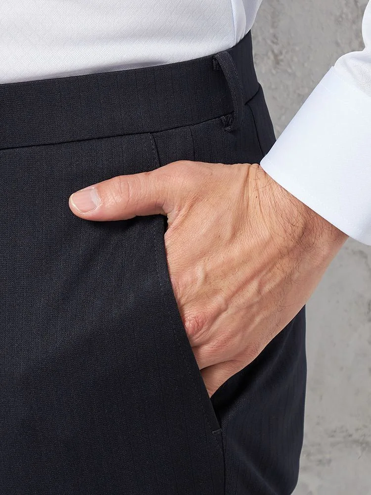 パンツの腰回りに生地の折り込みがなく、スッキリとしたシルエットを実現します。シンプルで洗練された印象を与え、すっきりとした着こなしが可能です。