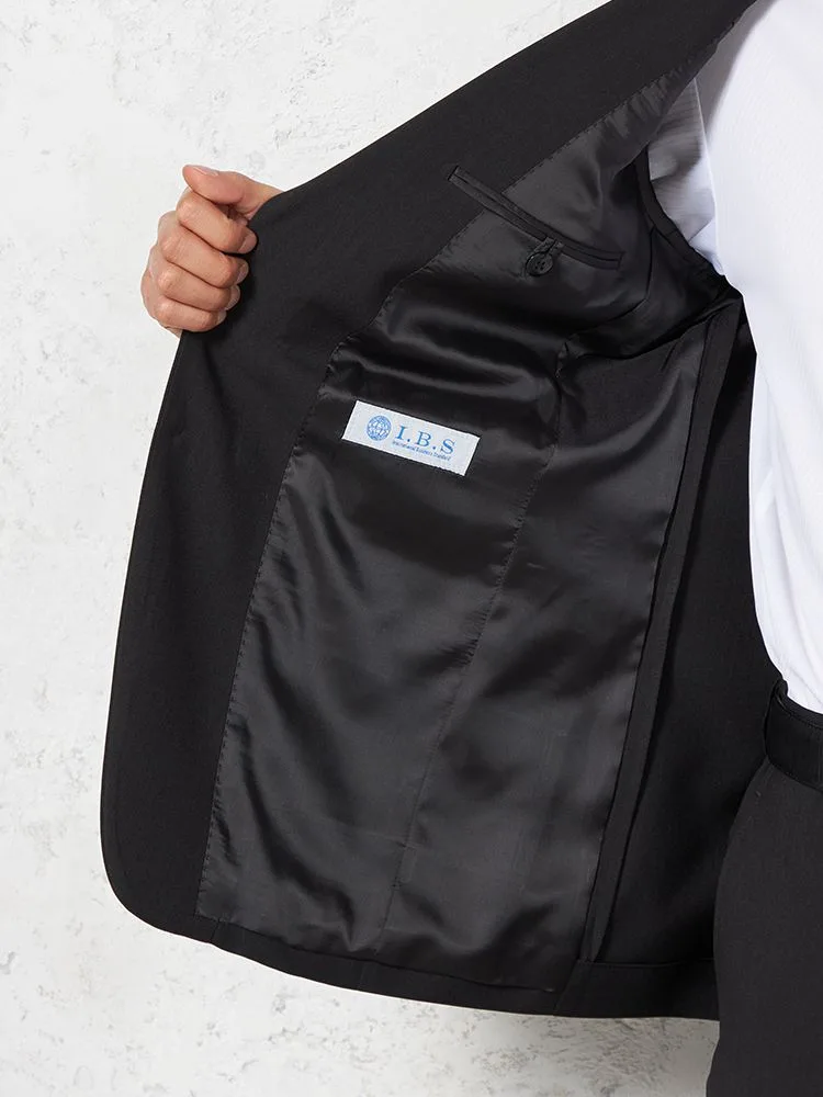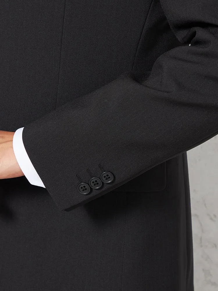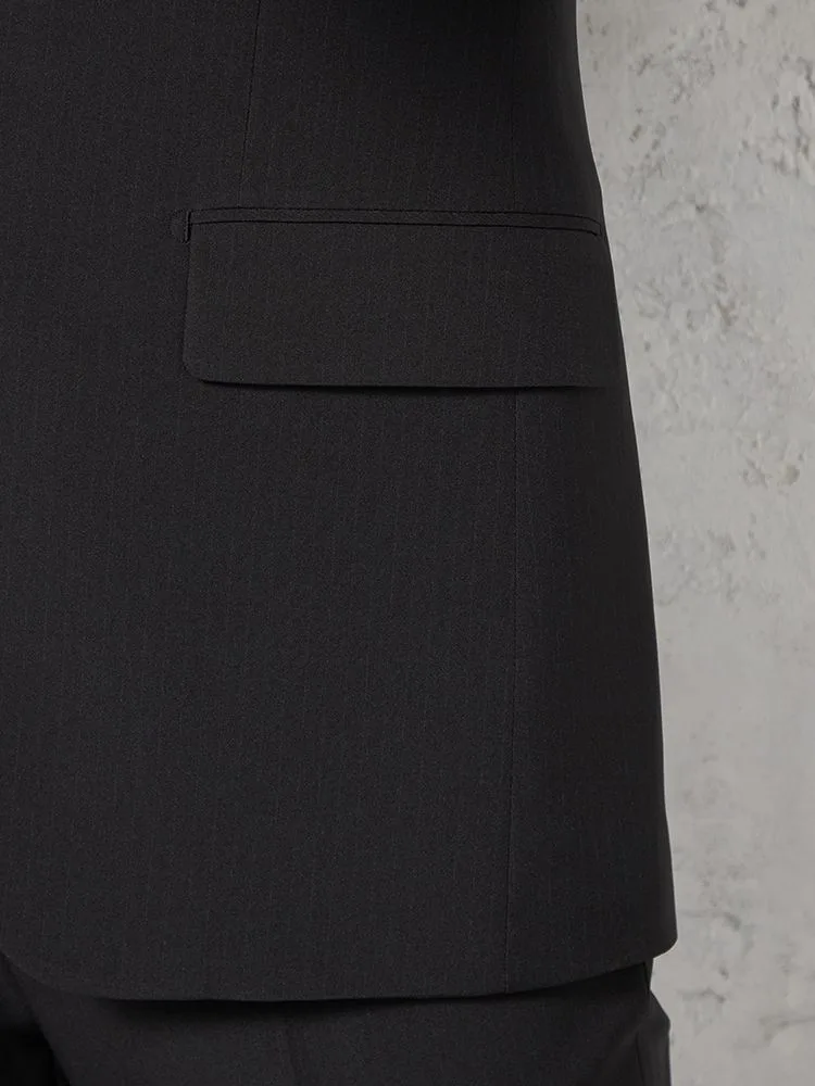 スタンダードなブラックストライプ柄は、ベーシックなラペルに上下すっきりとしたシルエットで、