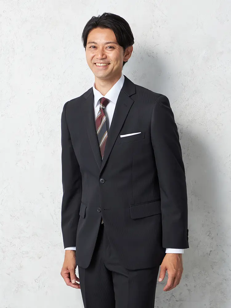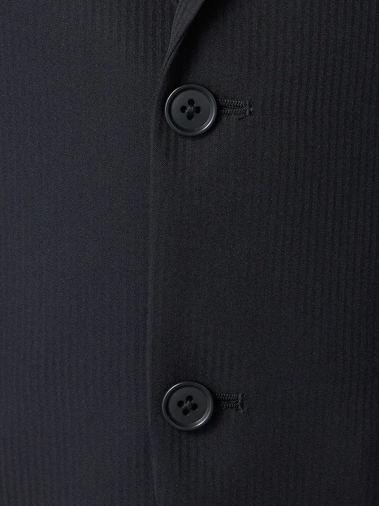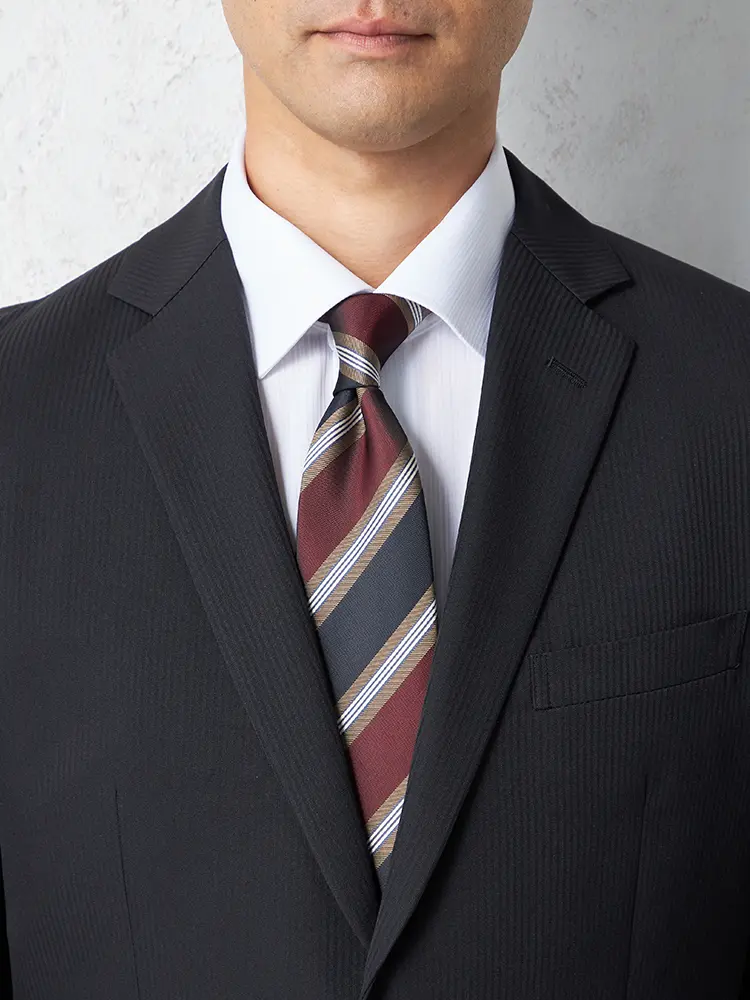 上品なストライプのベーシックな2つボタンスーツ。