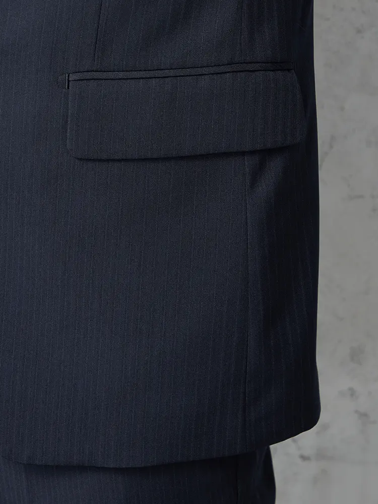 上品なストライプのベーシックな2つボタンスーツ。