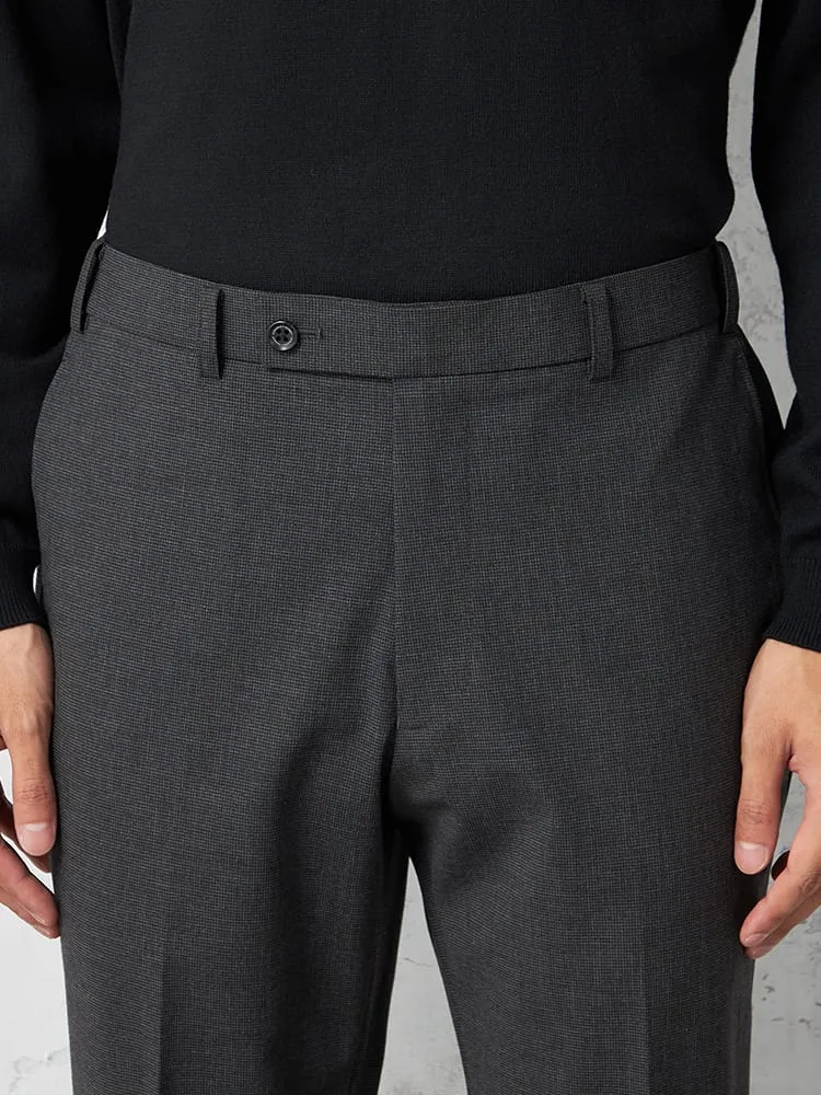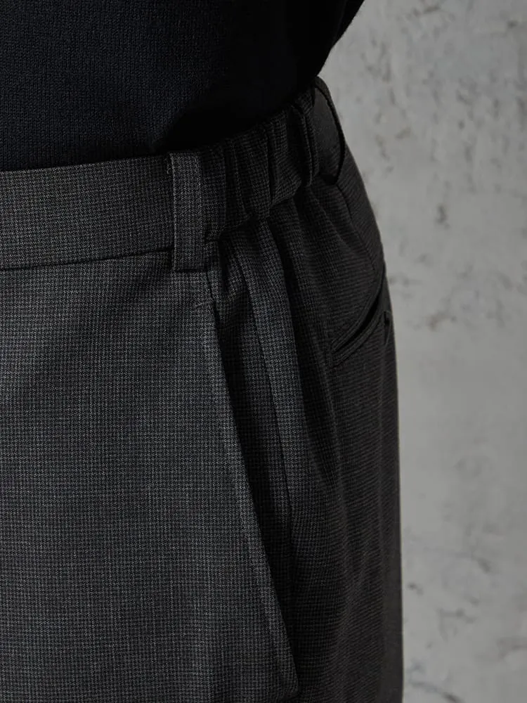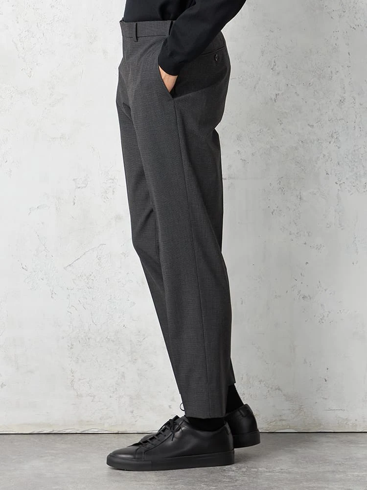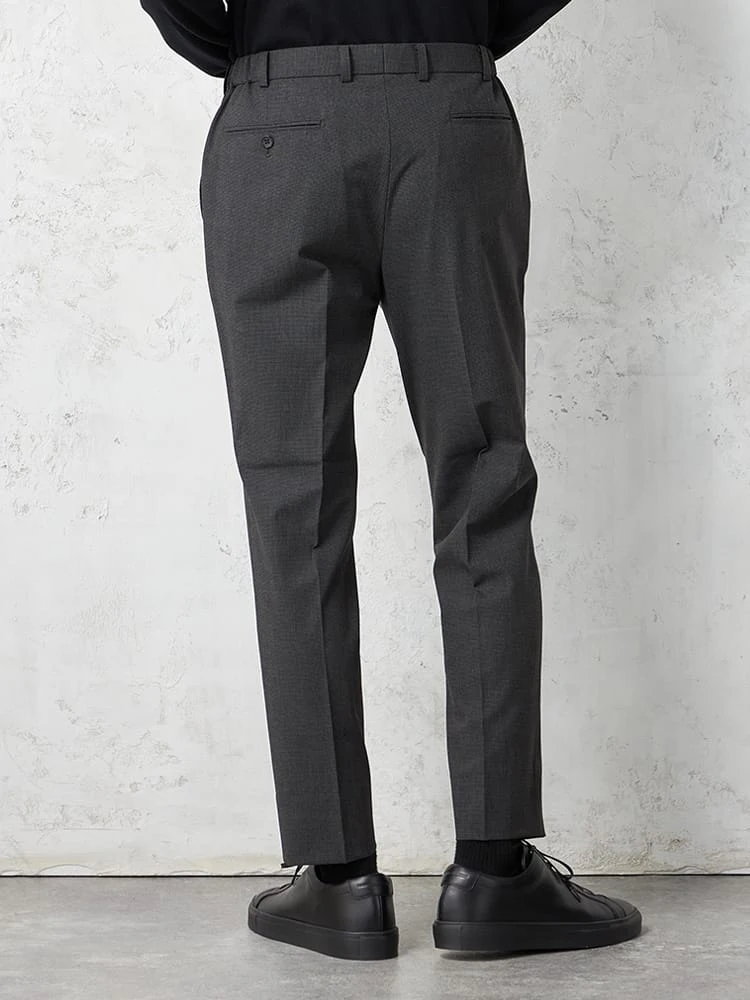 パンツの腰回りに生地の折り込みがなく、スッキリとしたシルエットを実現します。シンプルで洗練された印象を与え、すっきりとした着こなしが可能です。