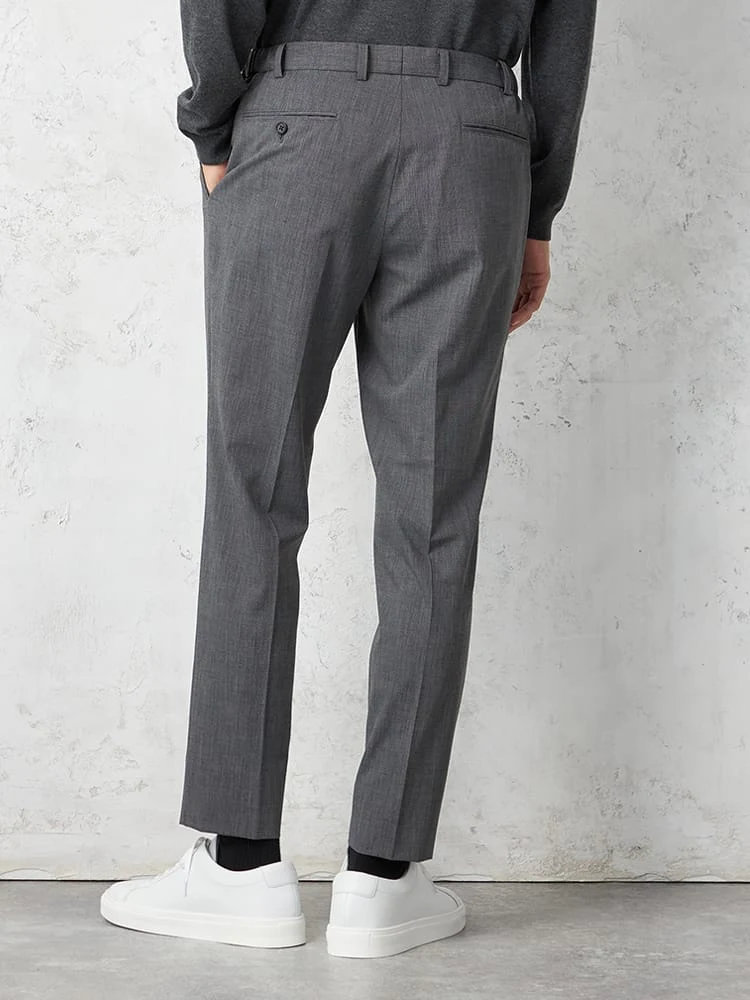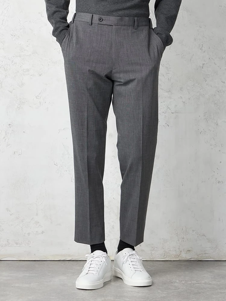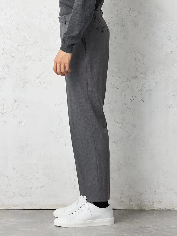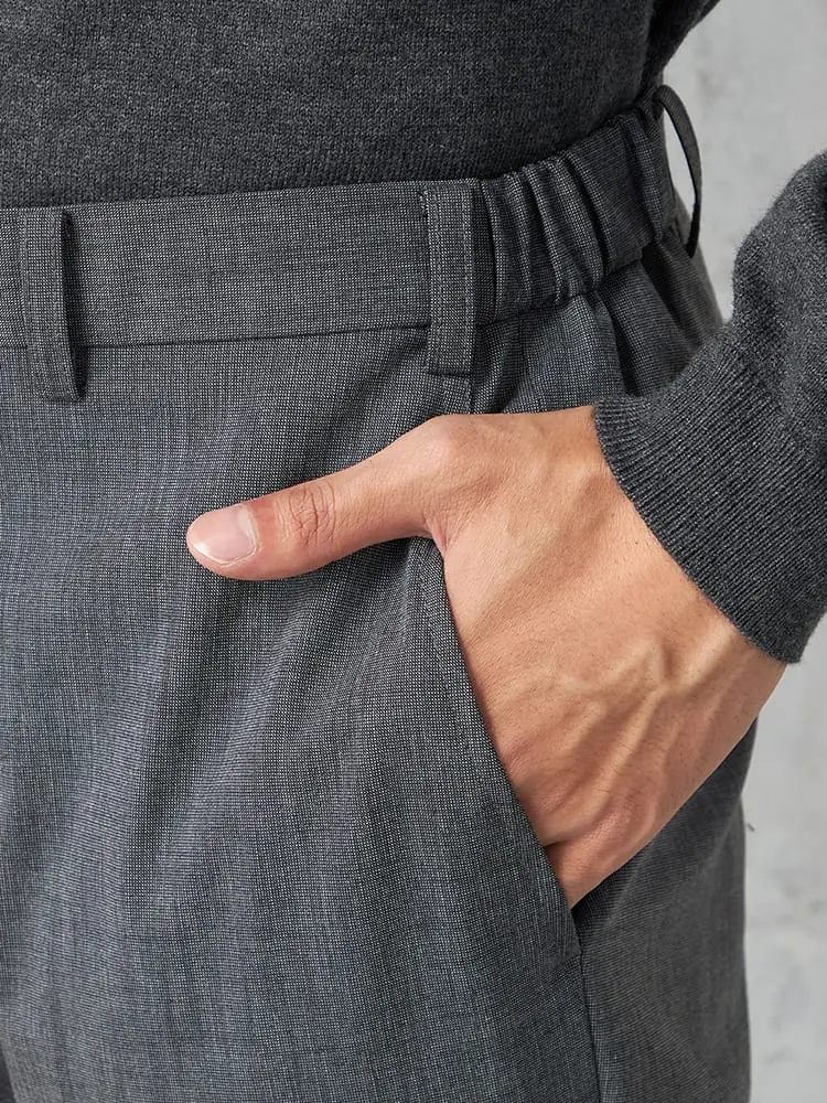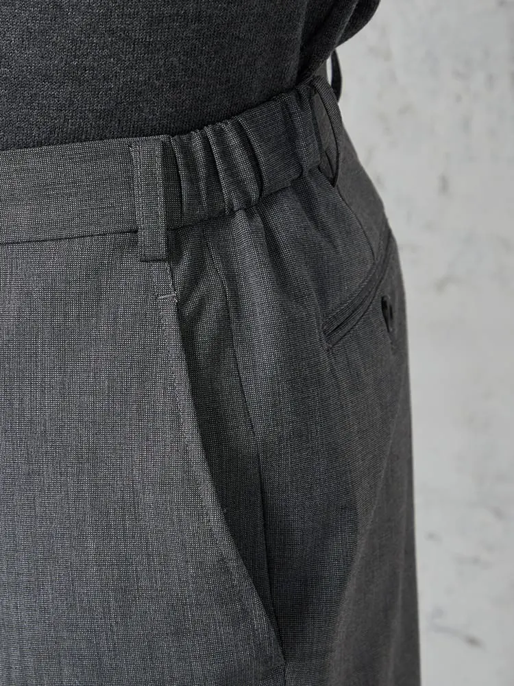 パンツの腰回りに生地の折り込みがなく、スッキリとしたシルエットを実現します。シンプルで洗練された印象を与え、すっきりとした着こなしが可能です。