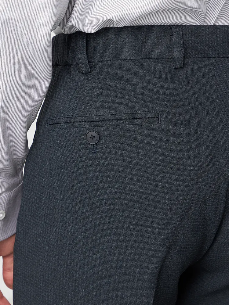 パンツの腰回りに生地の折り込みがなく、スッキリとしたシルエットを実現します。シンプルで洗練された印象を与え、すっきりとした着こなしが可能です。