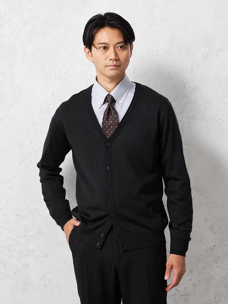 スタイルアレンジ用に一枚持っておきたい、静電気の発生や毛羽立ちを抑えてくれる、アンチピリングと静電気対策を備え保温性もあるVネックのニットカーディガンです。前開きで着脱がしやすいため、室内の暖房が効いていて暑いときに、すぐに脱げるのが最大の魅力。スーツやジャケットの中で、もたつかないサイズ感の定番無地ニットは家庭で洗濯可能(オシャレ着洗い)です。