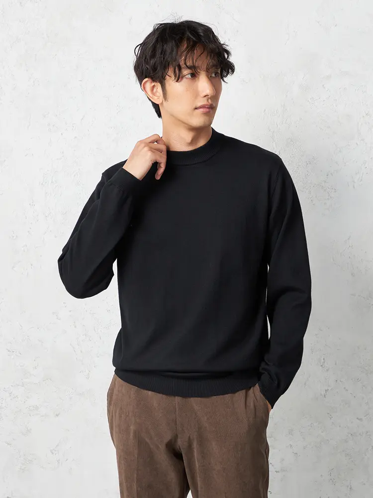 寒い季節にも快適に過ごすため、吸湿発熱素材を使用したモックネックロングスリーブニット。