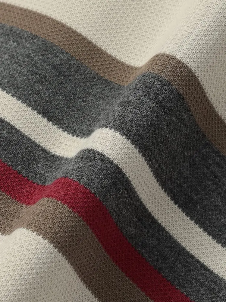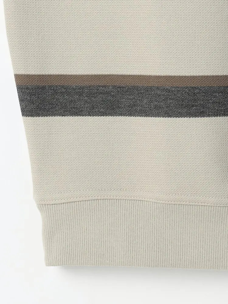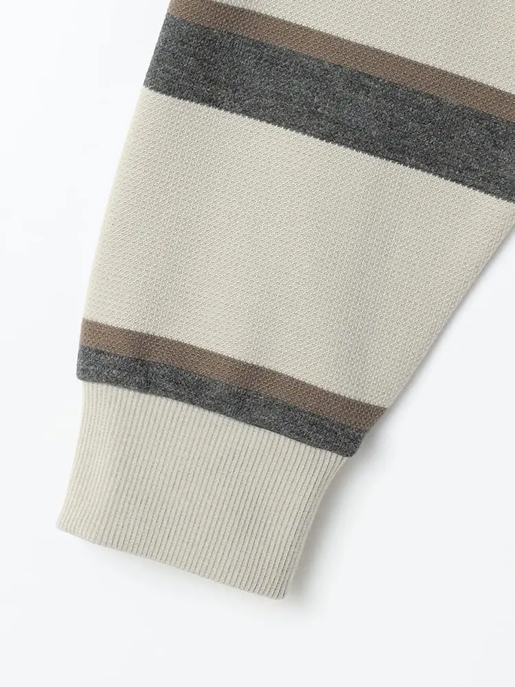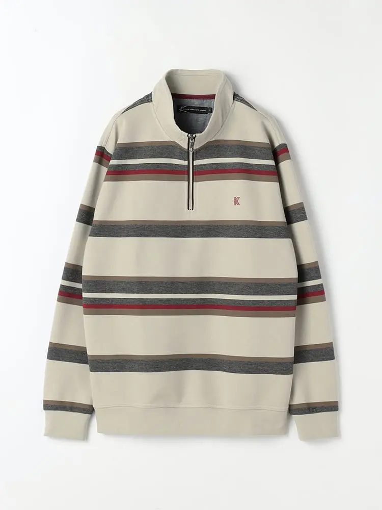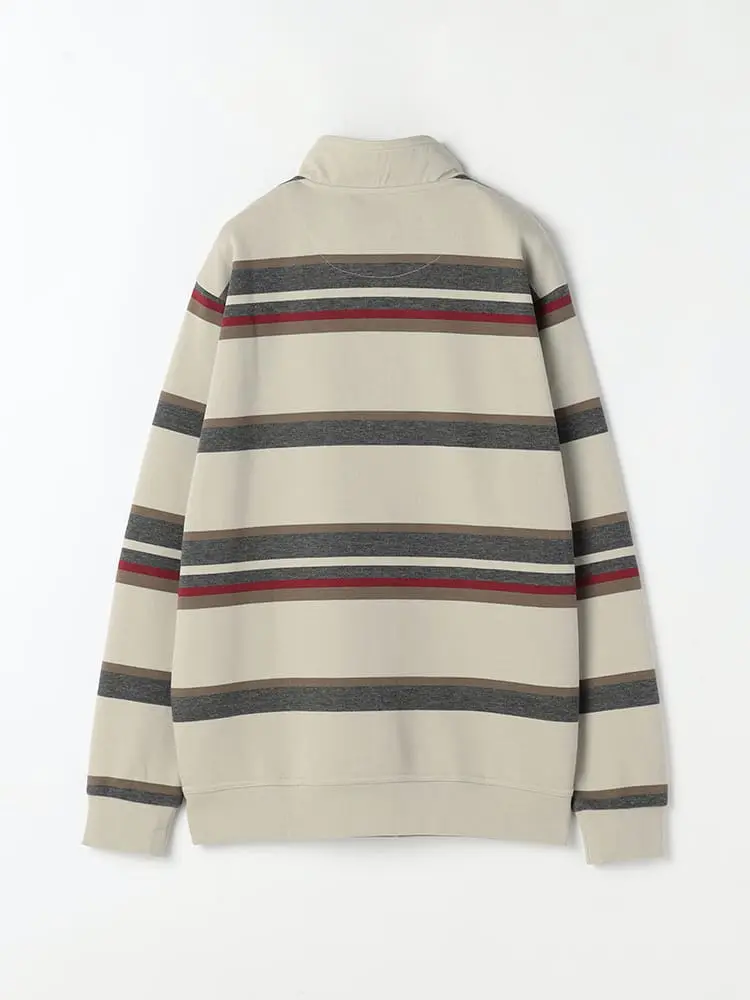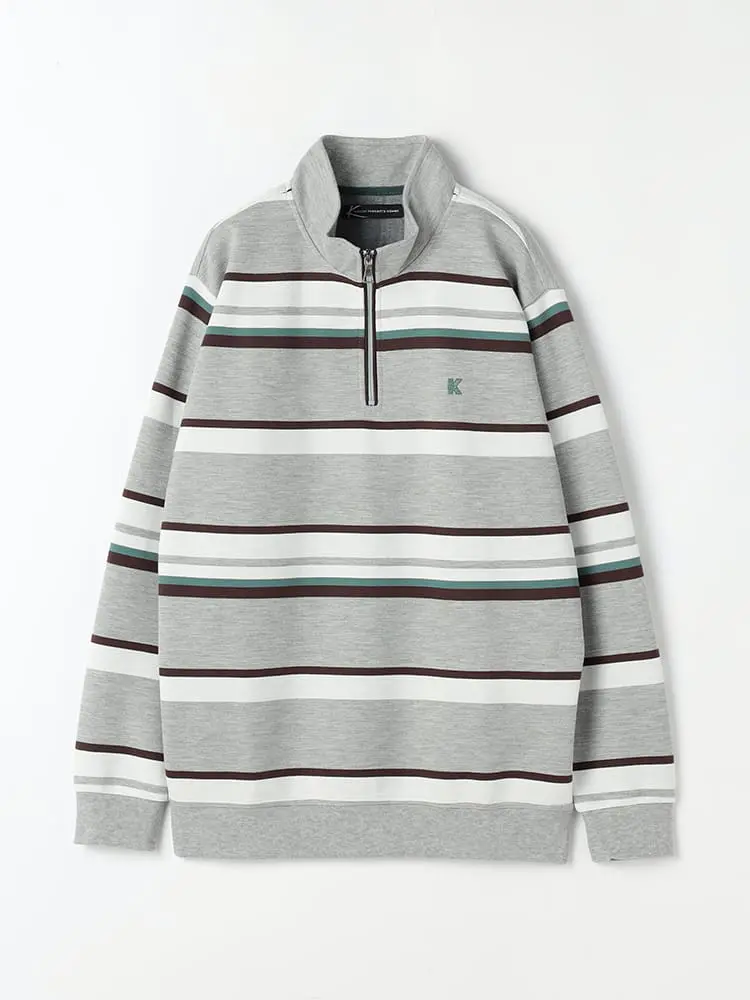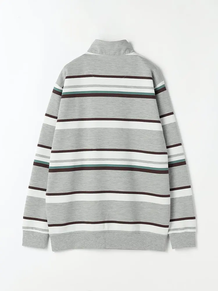 マルチカラーのボーダー柄が存在感を発揮するデザインのハーフジップトレーナーです。