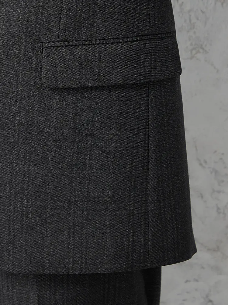 落ち着いたトラディショナルなチェック柄のバランスが良いセンターベントのスーツ。