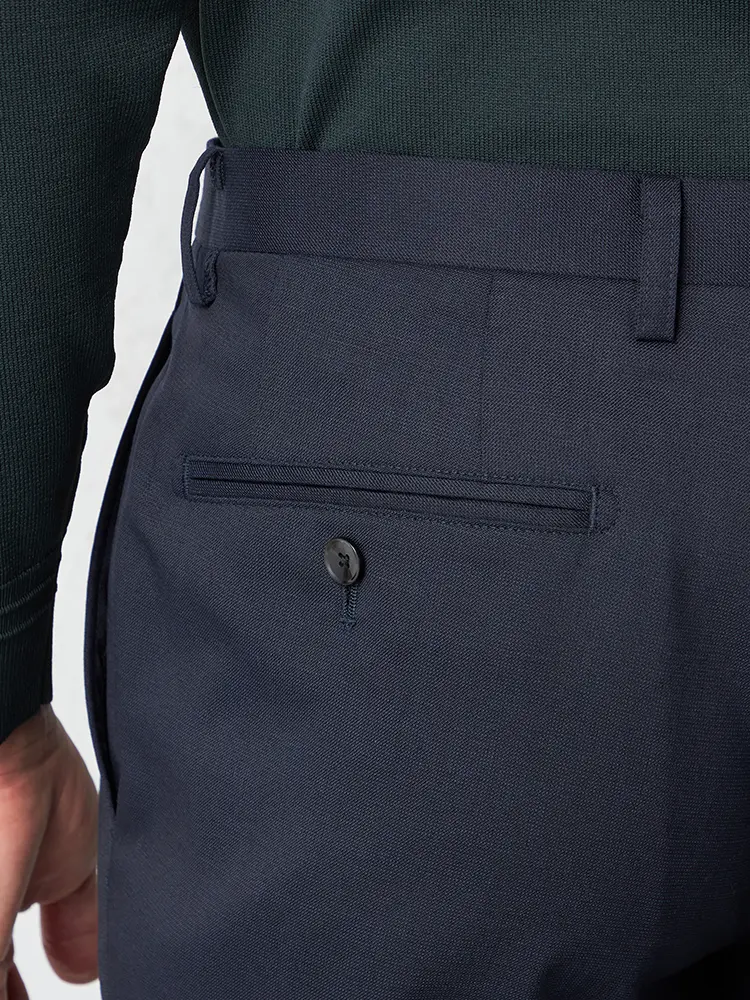両玉縁仕様のヒップポケットを高めの位置にセットしたことで後ろ姿もすっきり。