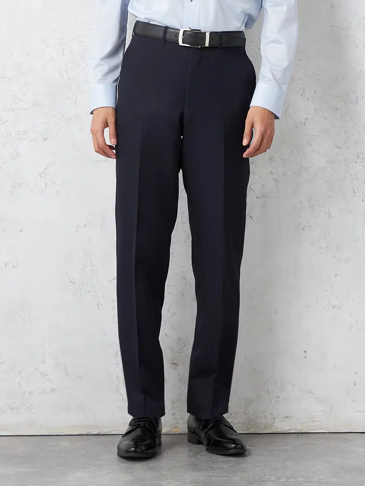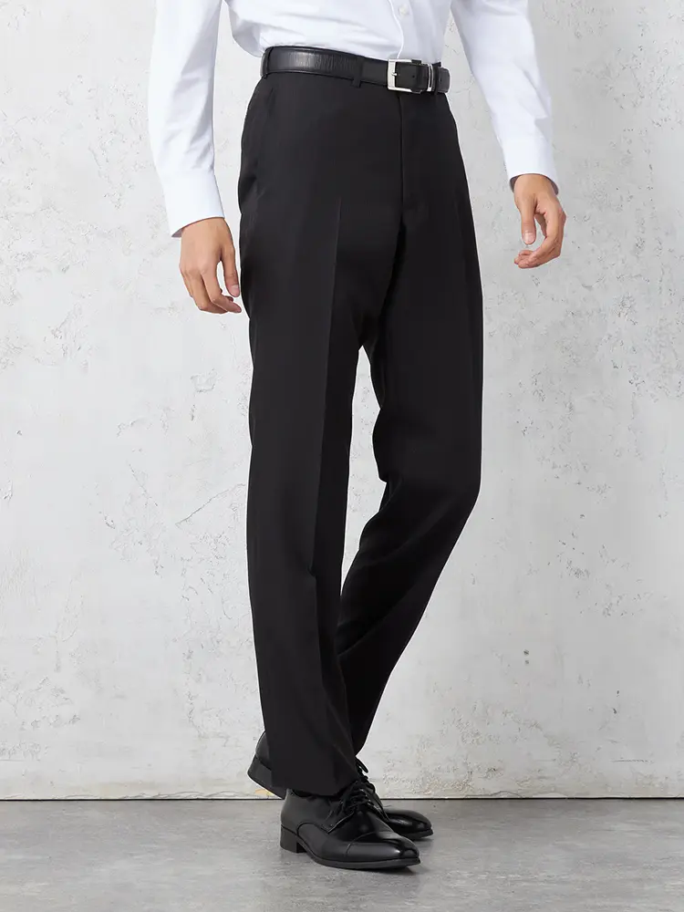 パンツの腰回りに生地の折り込みがなく、スッキリとしたシルエットを実現します。シンプルで洗練された印象を与え、すっきりとした着こなしが可能です。